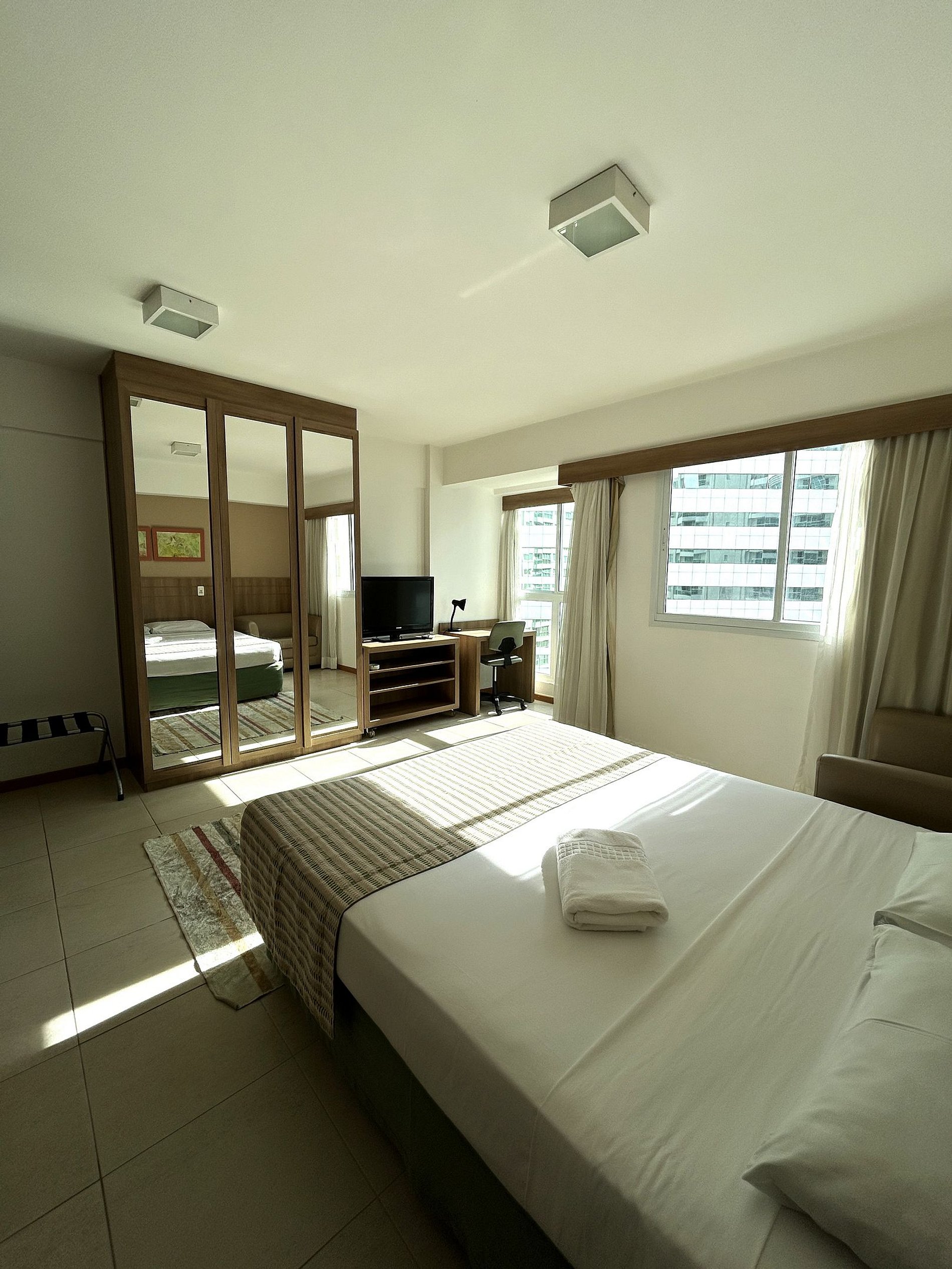 Acomodação 9º andar: Nossa equipe oferece uma experiência excepcional para os hóspedes. Com acomodações confortáveis, serviço de qualidade e atendimento humanizado, garantimos que sua estadia seja memorável. O flat, com 22m², possui ar condicionado e black-out para uma noite tranquila de sono. Além disso, o hotel conta com serviço de quarto 24hrs, roupas de cama limpas e higienizadas e um chuveiro incrível para um banho relaxante. E se caso preferir preparar sua própria comida, o ap possui cozinha compacta para refeições básicas, e geladeira para guardar o seus alimentos A recepção e segurança funcionam 24 horas por dia, proporcionando tranquilidade durante toda a sua estadia. Queremos que vocês se sintam em casa. Estamos prontas para oferecer um atendimento personalizado e garantir que todas as suas necessidades sejam atendidas. Com serviço de quarto e serviços de manutenção disponíveis quando necessário, você terá uma estadia confortável e conveniente.