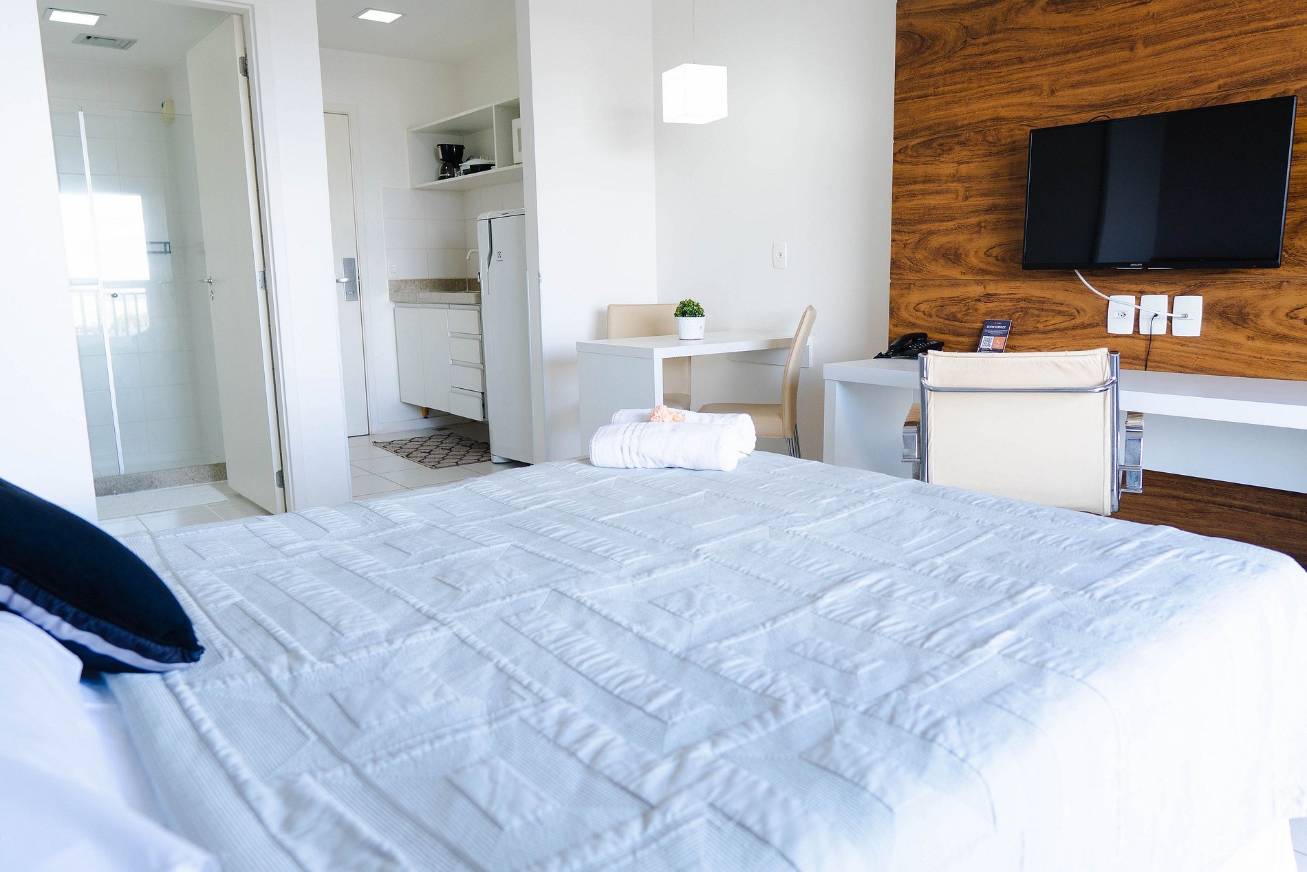 O espaço conta com uma cozinha equipada para a realizações de refeições práticas. Na cozinha possui, cooktop, micro-ondas , cafeteira café coado, chaleira e sanduicheira. O quarto acomoda muito bem 3 hóspedes, Possui uma cama queen e em casos de 3 hóspedes disponibilizamos 1 colchão extra. Deixamos um Chromecast para que você possa espelhar o celular e assistir as plataformas de streamings.