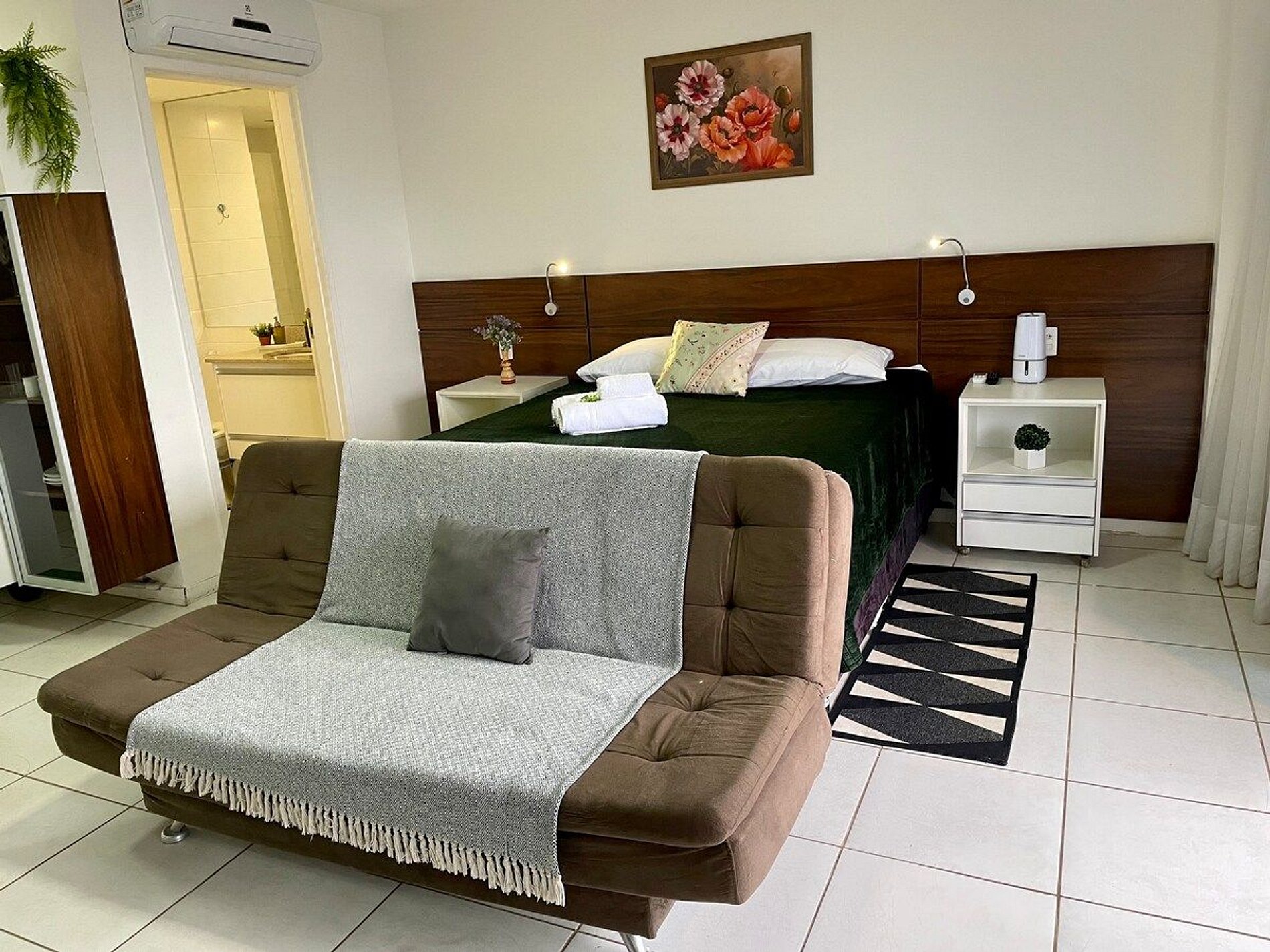 O flat, com 44m², possui ar condicionado e black-out para uma noite tranquila de sono. Além disso, o hotel conta com serviço de quarto 24hrs, roupas de cama limpas e higienizadas e um chuveiro incrível para um banho relaxante. E se caso preferir preparar sua própria comida, o ap possui cozinha compacta para refeições básicas, e geladeira para guardar o seus alimentos. A recepção e segurança funcionam 24 horas por dia, proporcionando tranquilidade durante toda a sua estadia.