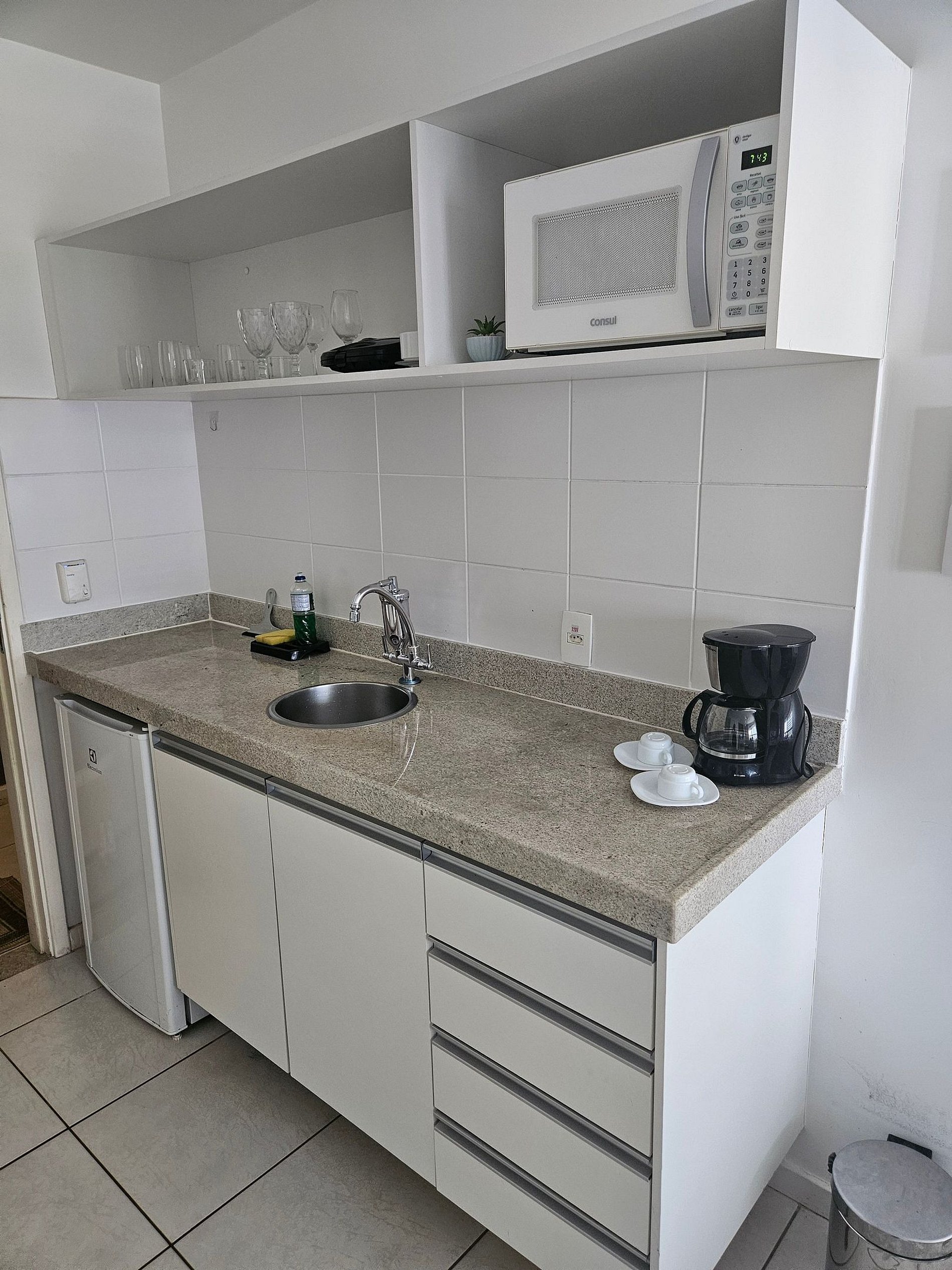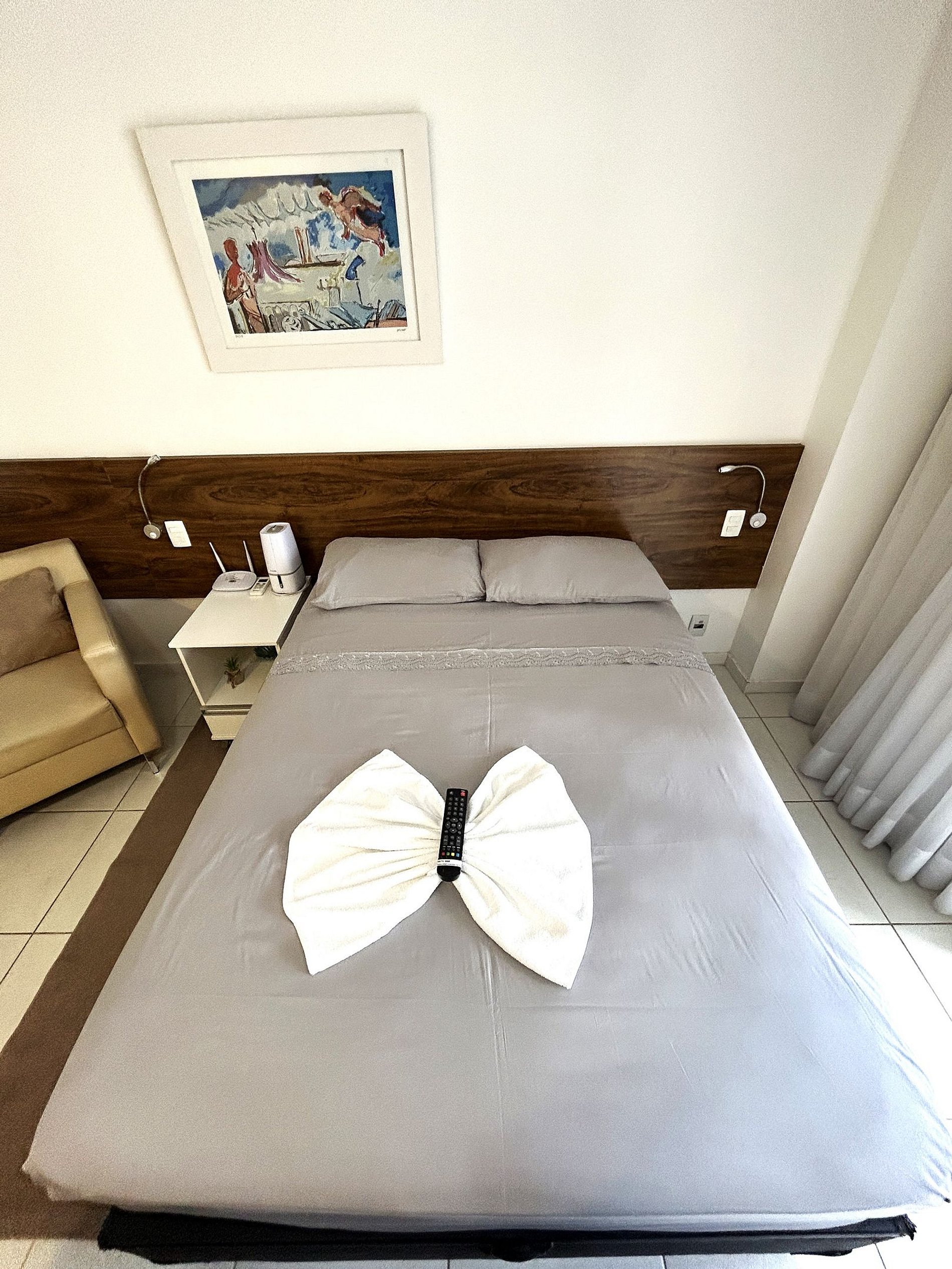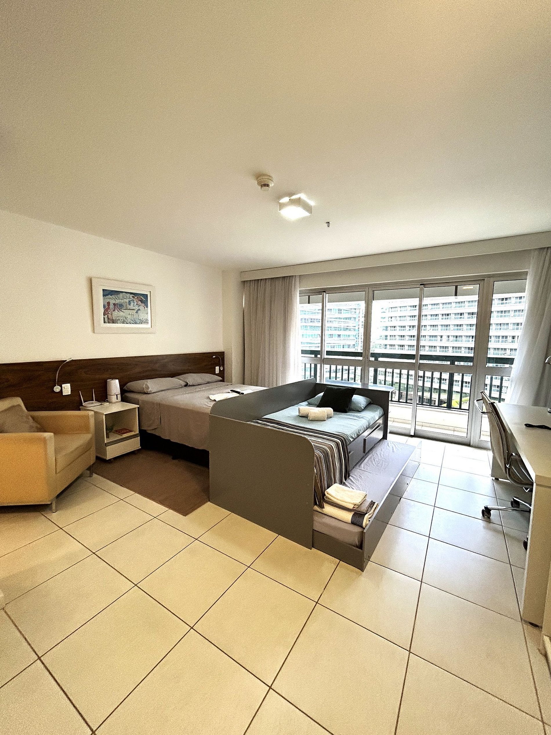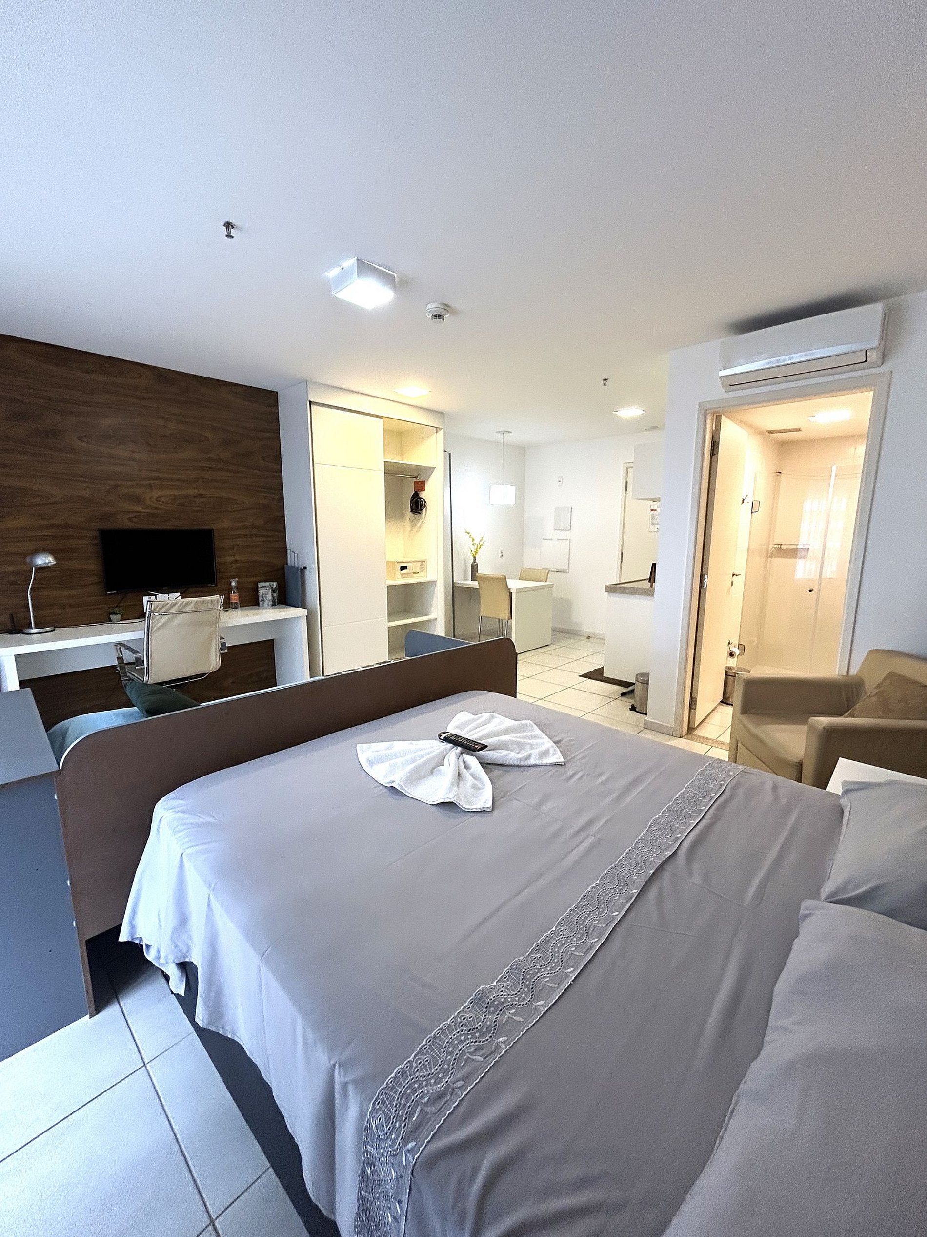 O flat, com 37m², possui ar condicionado e black-out para uma noite tranquila de sono. Além disso, o hotel conta com serviço de quarto 24hrs, roupas de cama limpas e higienizadas e um chuveiro incrível para um banho relaxante. E se caso preferir preparar sua própria comida, o ap possui cozinha compacta para refeições básicas, e geladeira para guardar o seus alimentos. A recepção e segurança funcionam 24 horas por dia, proporcionando tranquilidade durante toda a sua estadia.