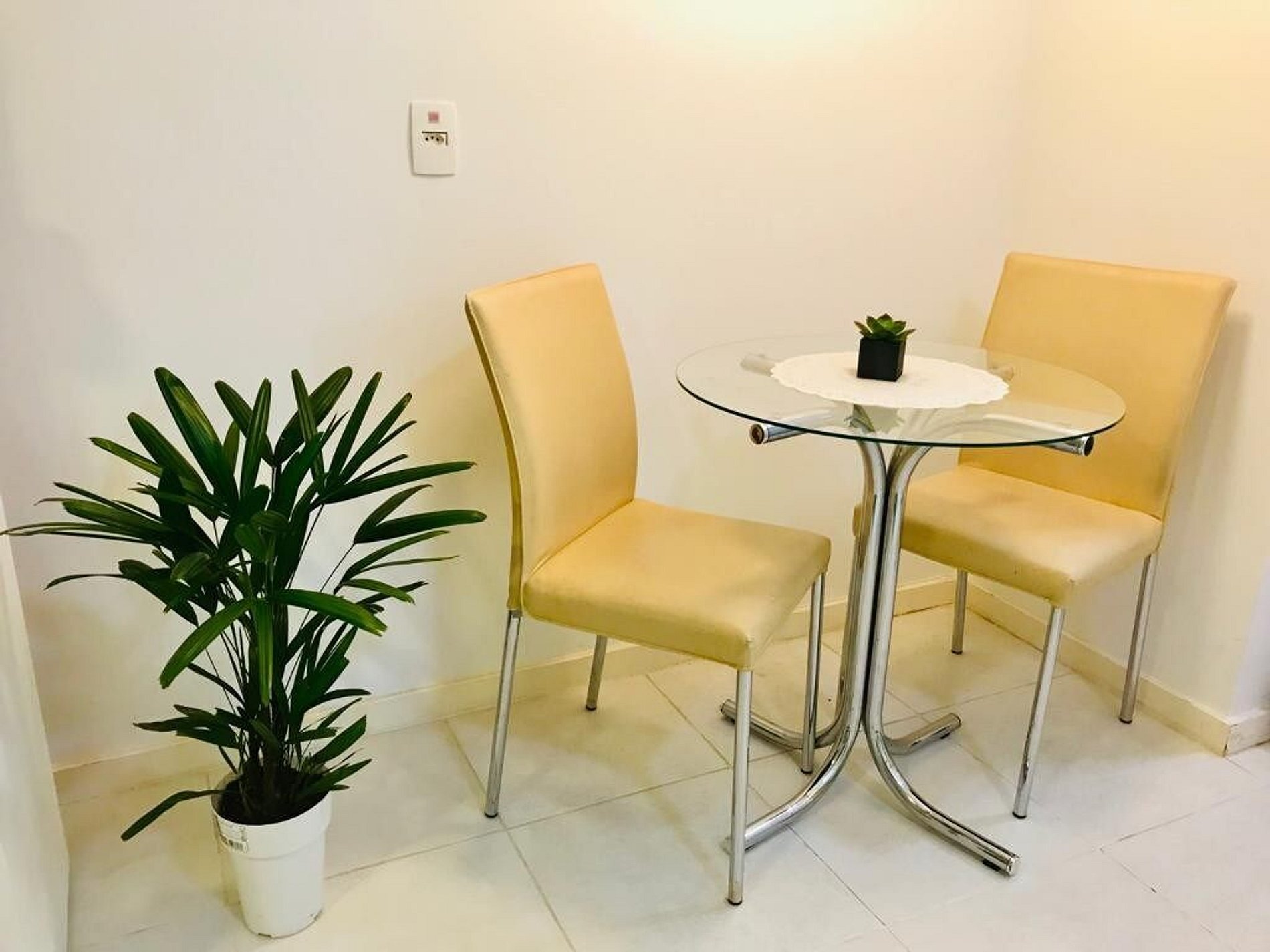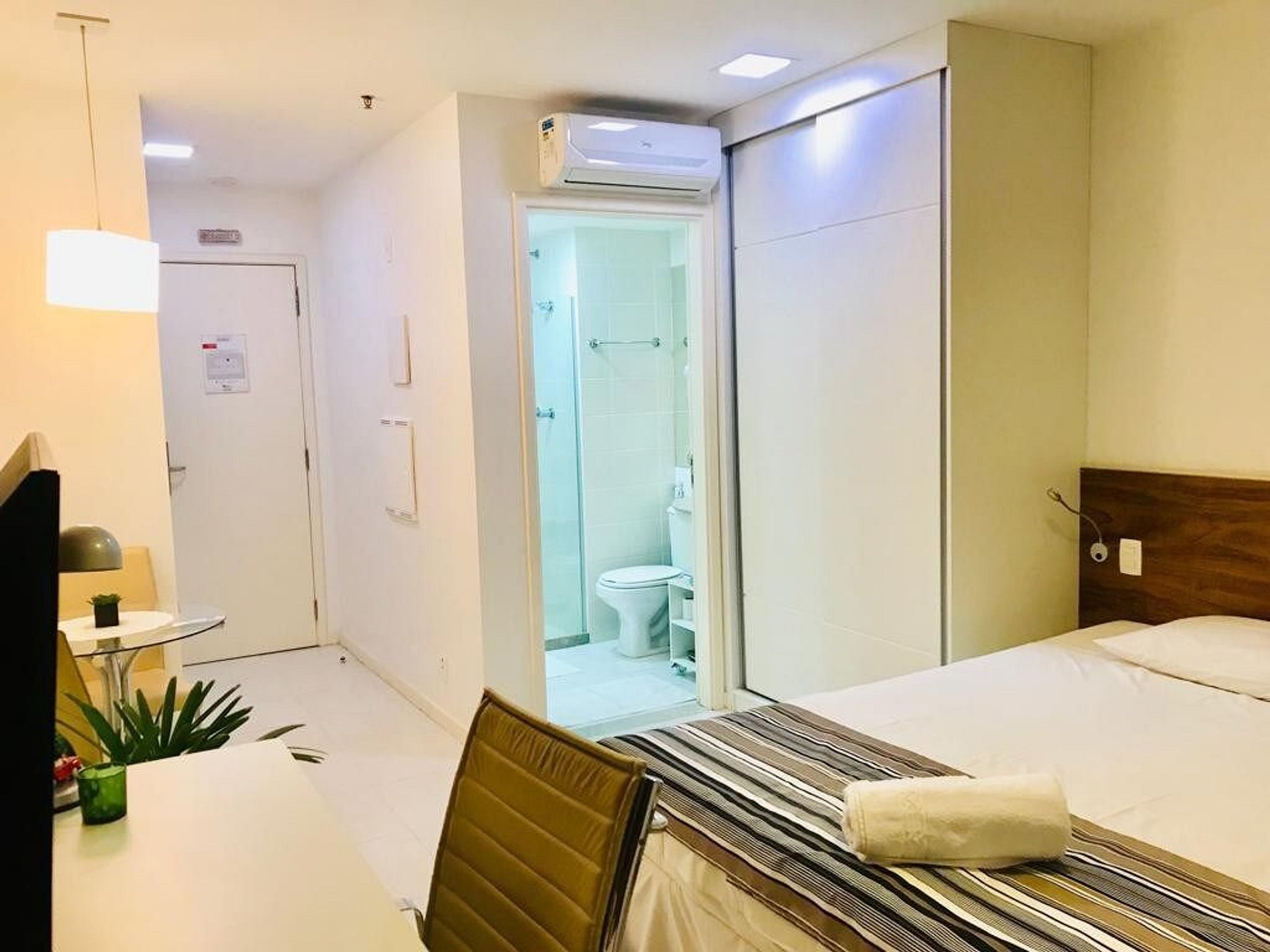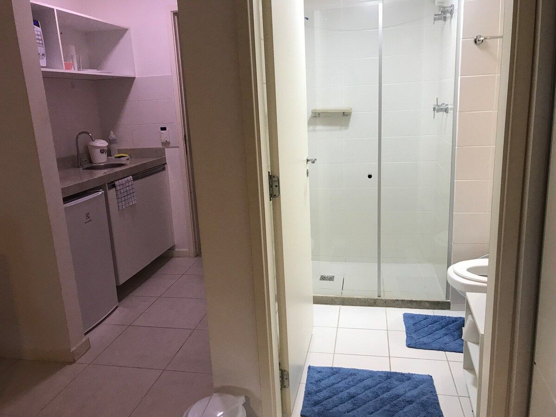 O flat, com 27m², possui ar condicionado e black-out para uma noite tranquila de sono. Além disso, o hotel conta com serviço de quarto 24hrs, roupas de cama limpas e higienizadas e um chuveiro incrível para um banho relaxante. E se caso preferir preparar sua própria comida, o ap possui cozinha compacta para refeições básicas e equipada com cooktop, sanduicheira, cafeteira, mircoondas e geladeira para guardar o seus alimentos. A recepção e segurança funcionam 24 horas por dia, proporcionando tranquilidade durante toda a sua estadia.
