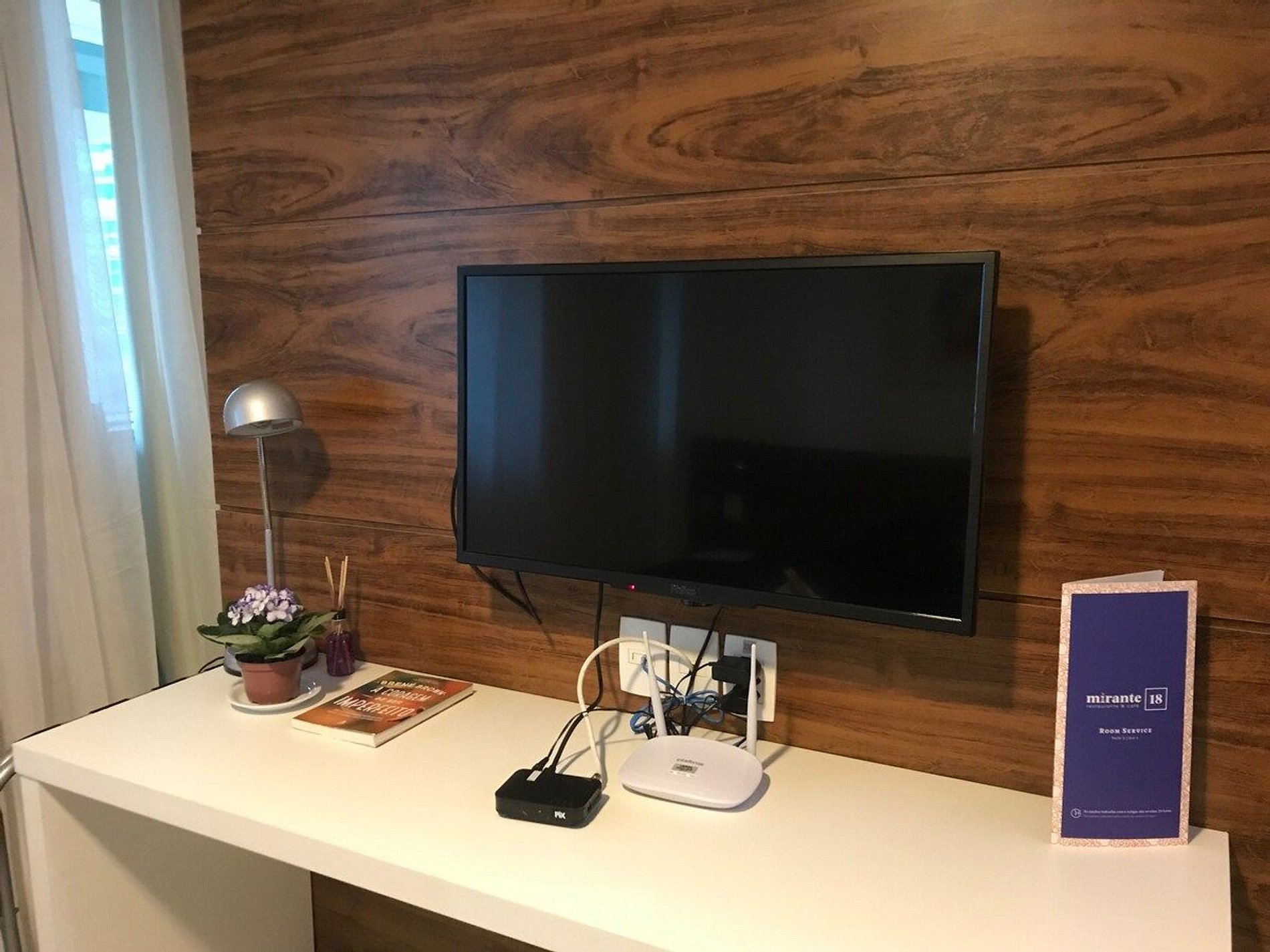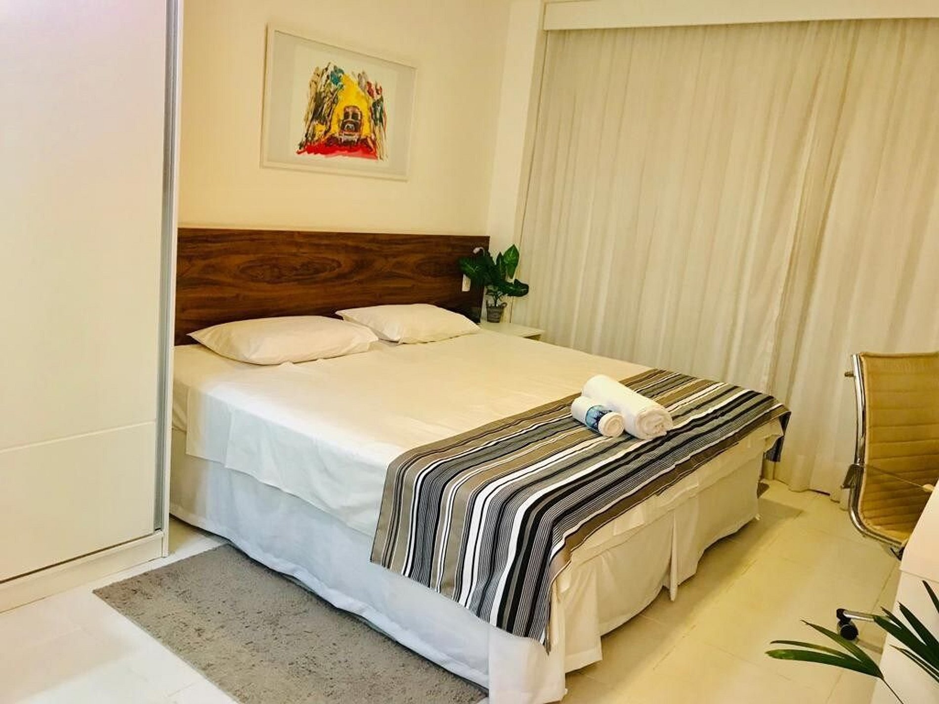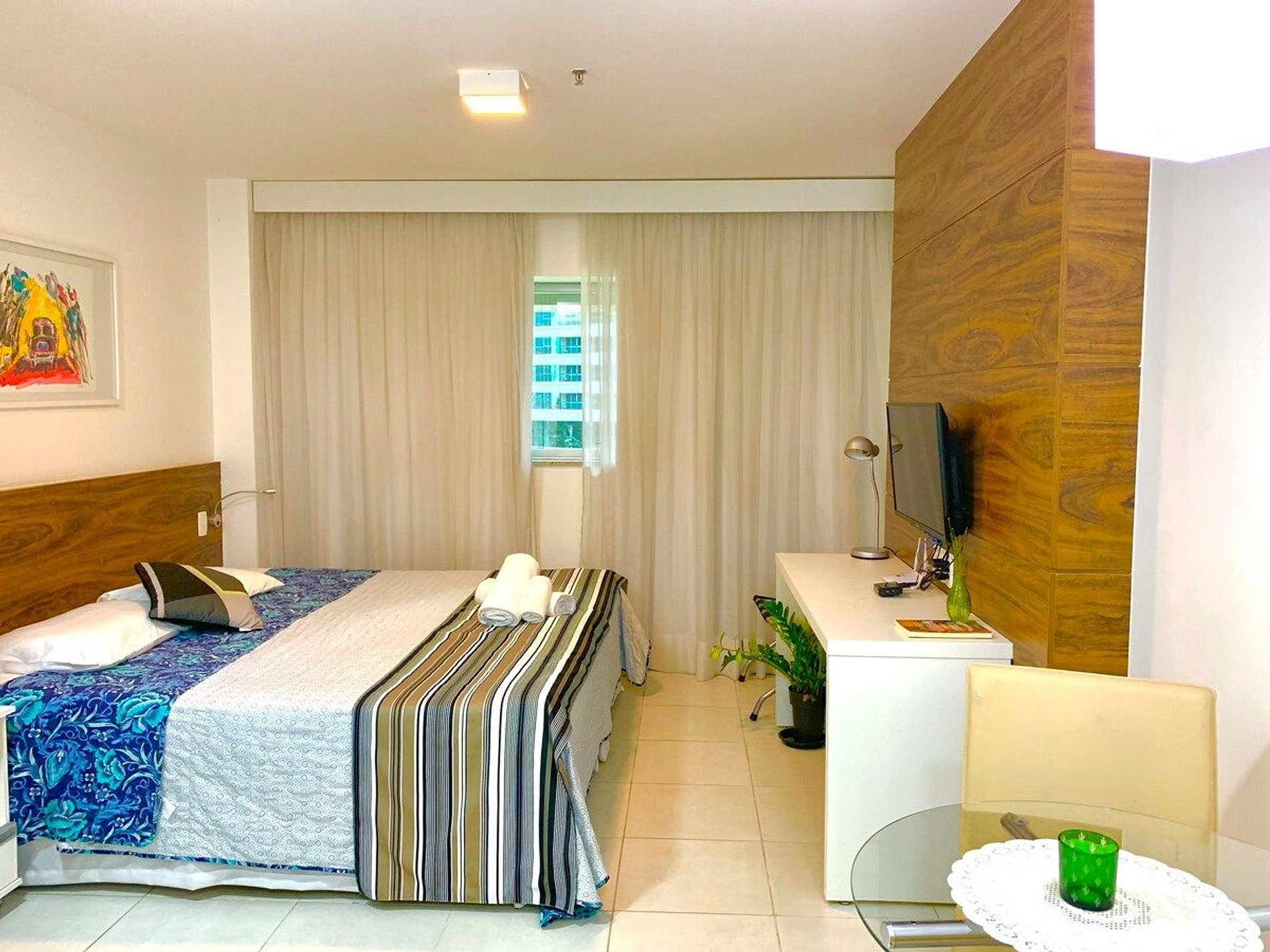 O flat, com 27m², possui ar condicionado e black-out para uma noite tranquila de sono. Além disso, o hotel conta com serviço de quarto 24hrs, roupas de cama limpas e higienizadas e um chuveiro incrível para um banho relaxante. E se caso preferir preparar sua própria comida, o ap possui cozinha compacta para refeições básicas e equipada com cooktop, sanduicheira, cafeteira, mircoondas e geladeira para guardar o seus alimentos. A recepção e segurança funcionam 24 horas por dia, proporcionando tranquilidade durante toda a sua estadia.