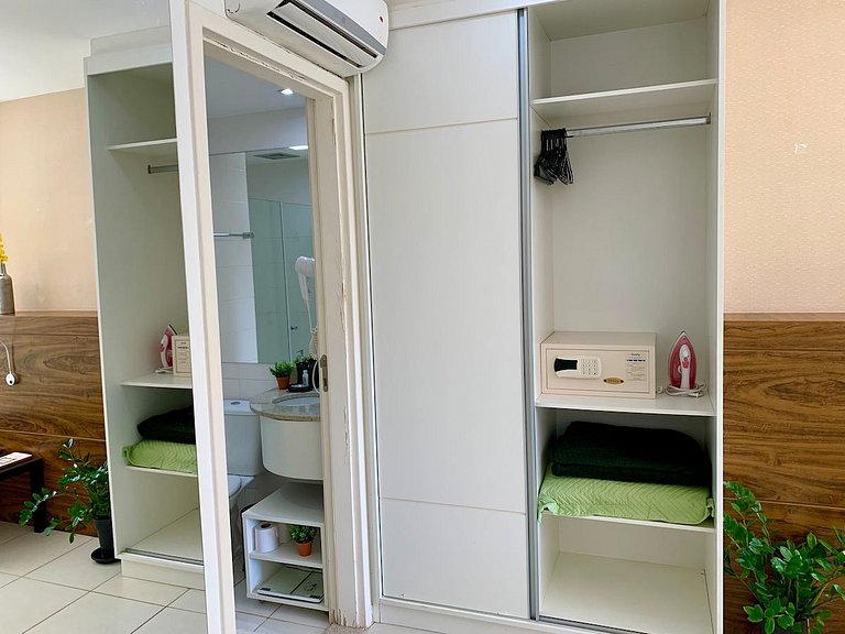 O flat, com 37m², possui ar condicionado e black-out para uma noite tranquila de sono. Além disso, o hotel conta com serviço de quarto 24hrs, roupas de cama limpas e higienizadas e um chuveiro incrível para um banho relaxante. E se caso preferir preparar sua própria comida, o ap possui cozinha compacta para refeições básicas, e geladeira para guardar o seus alimentos. A recepção e segurança funcionam 24 horas por dia, proporcionando tranquilidade durante toda a sua estadia.