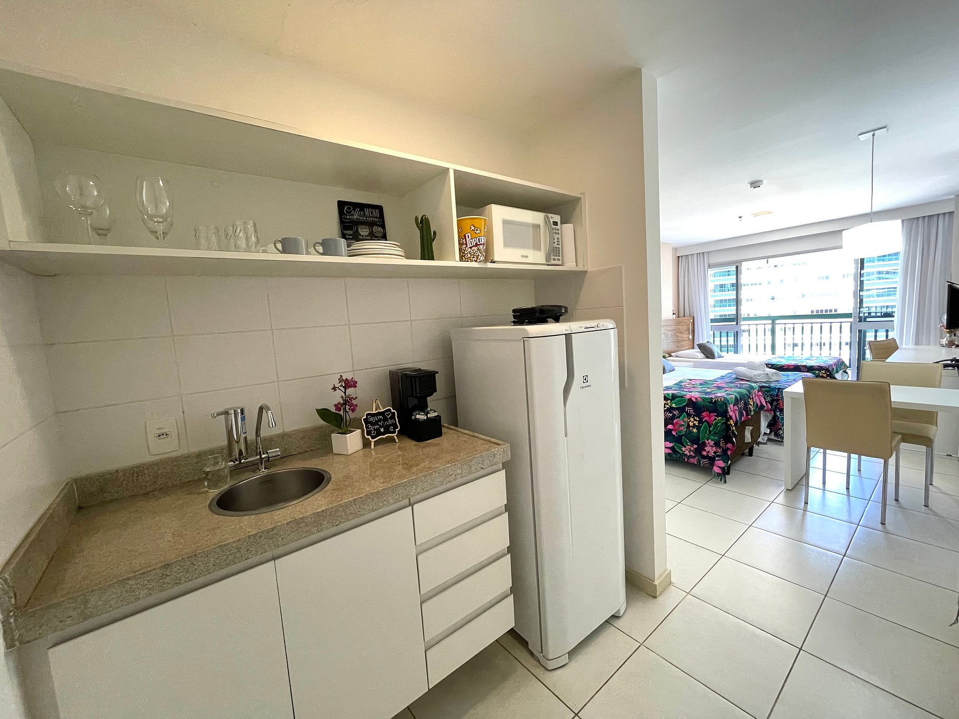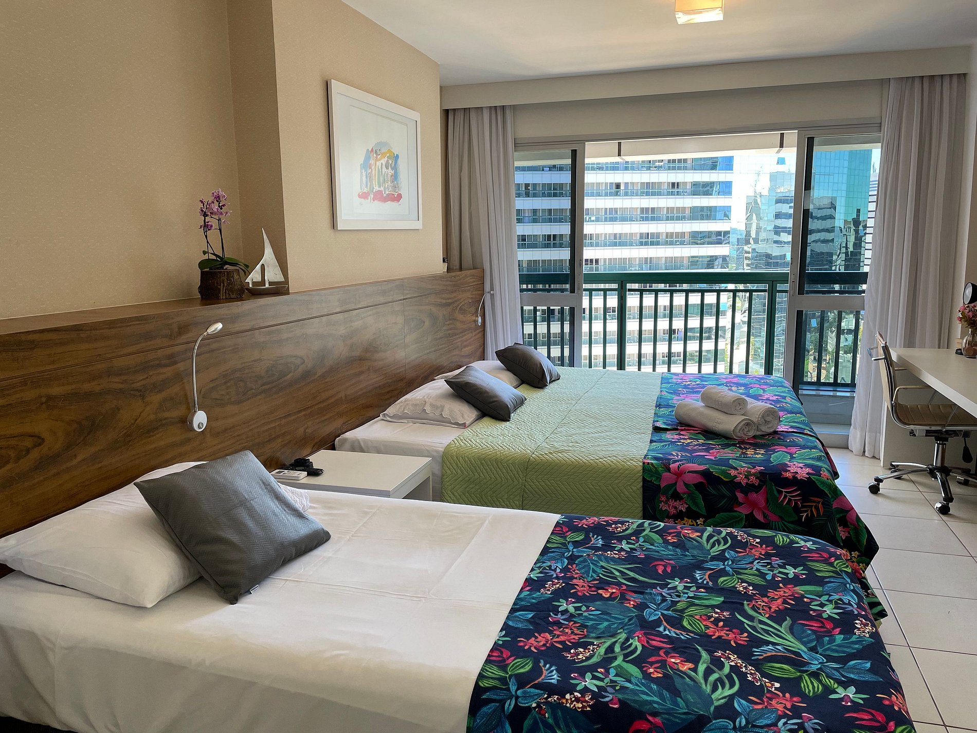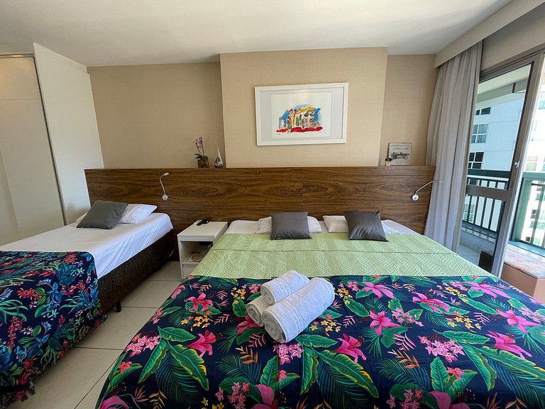 Nosso apartamento acomoda confortavelmente até 4 pessoas, com 1 cama king-size e uma bicama. Para garantir sua melhor experiência, solicitamos que informe com antecedência sua preferência de montagem das camas.