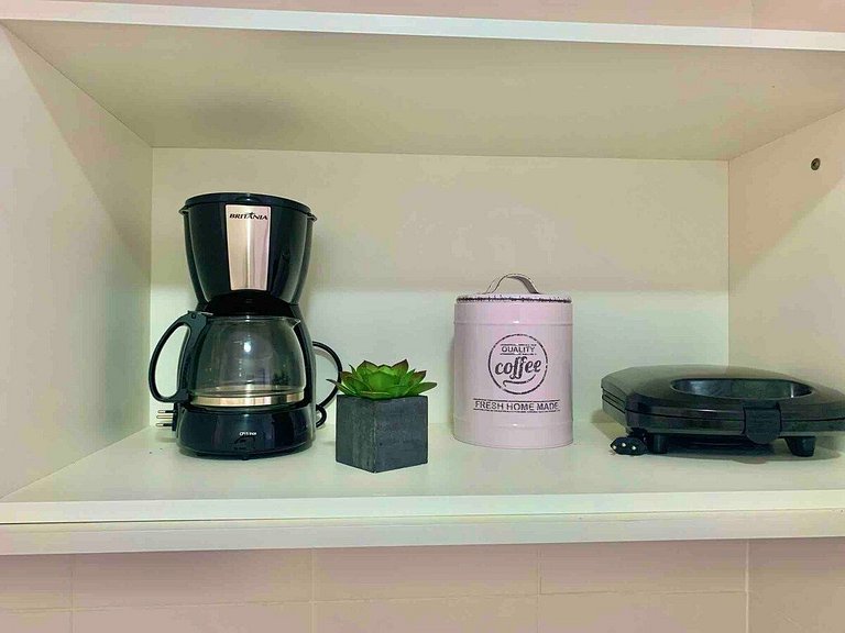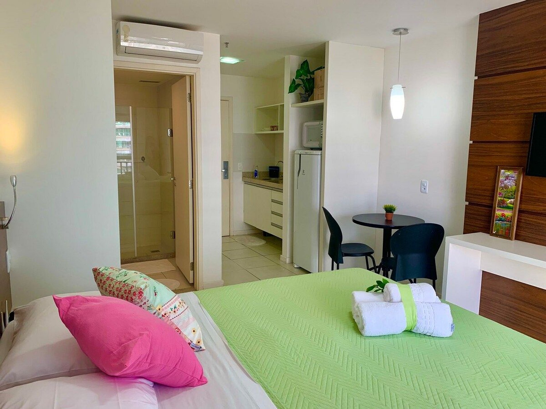 O flat, com 27m², possui ar condicionado e black-out para uma noite tranquila de sono. Além disso, o hotel conta com serviço de quarto 24hrs, roupas de cama limpas e higienizadas e um chuveiro incrível para um banho relaxante. E se caso preferir preparar sua própria comida, o ap possui cozinha compacta para refeições básicas, e geladeira para guardar o seus alimentos. A recepção e segurança funcionam 24 horas por dia, proporcionando tranquilidade durante toda a sua estadia.
