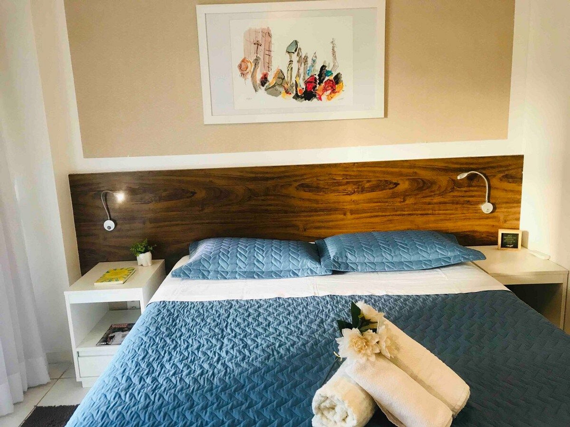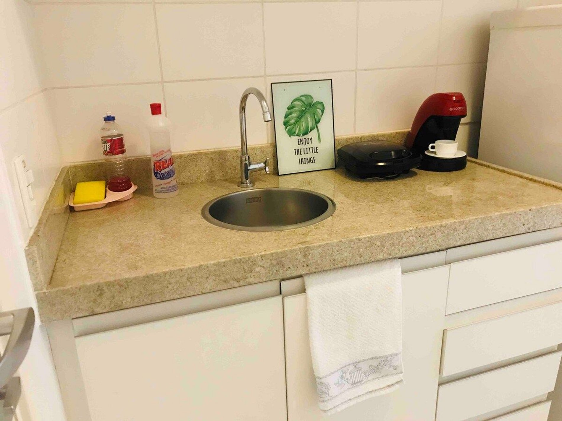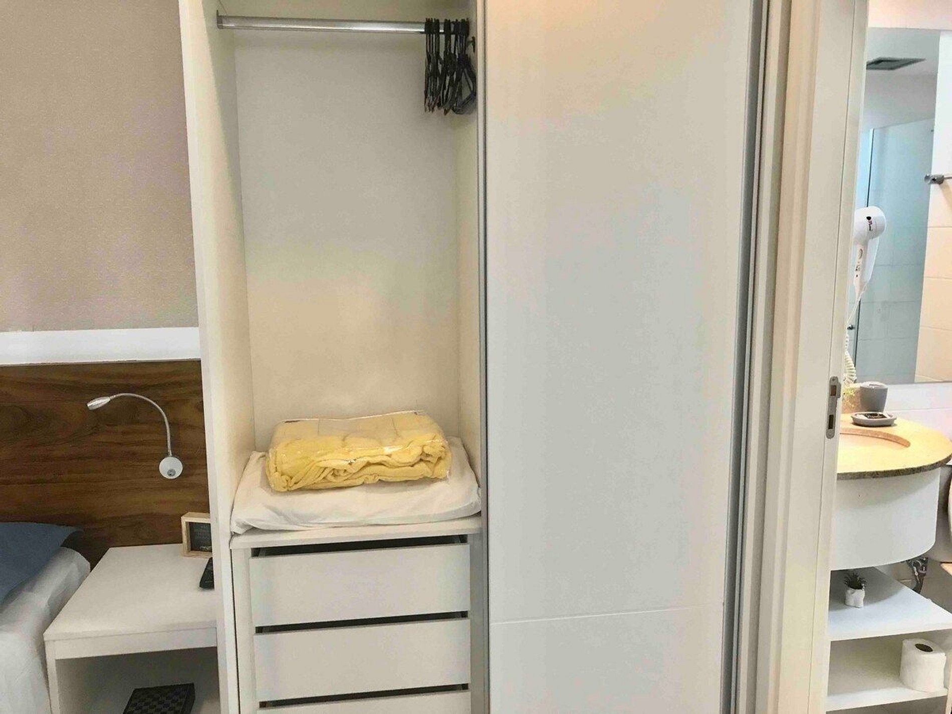 O flat, com 27m², possui ar condicionado e black-out para uma noite tranquila de sono. Além disso, o hotel conta com serviço de quarto 24hrs, roupas de cama limpas e higienizadas e um chuveiro incrível para um banho relaxante. E se caso preferir preparar sua própria comida, o ap possui cozinha compacta para refeições básicas, e geladeira para guardar o seus alimentos. A recepção e segurança funcionam 24 horas por dia, proporcionando tranquilidade durante toda a sua estadia.