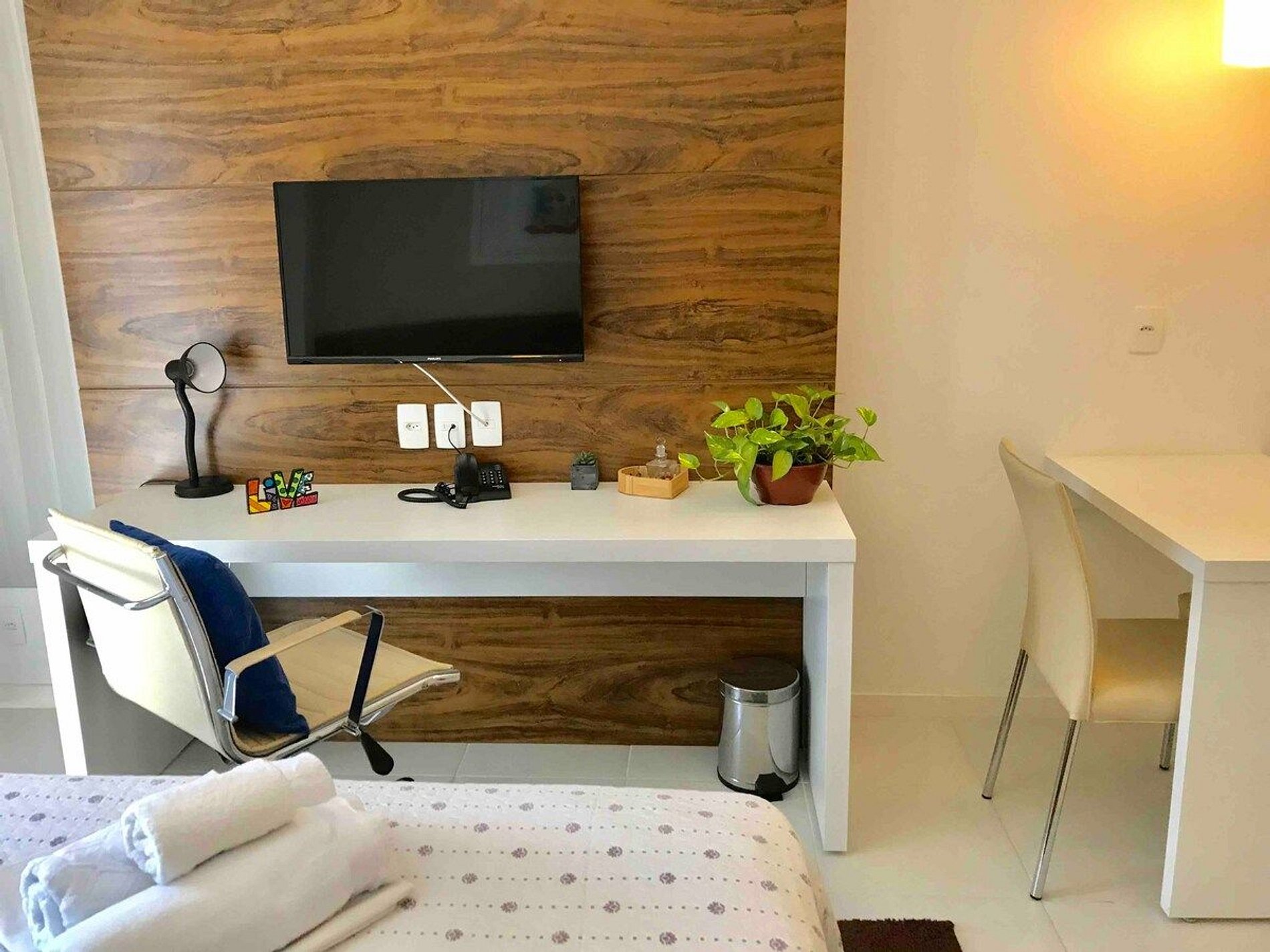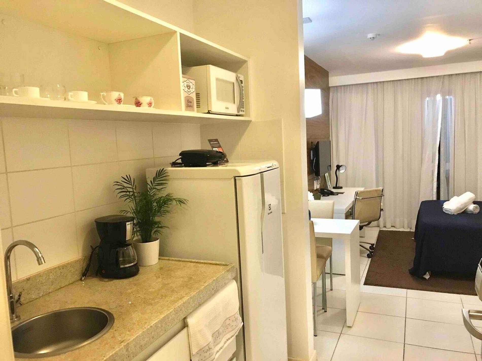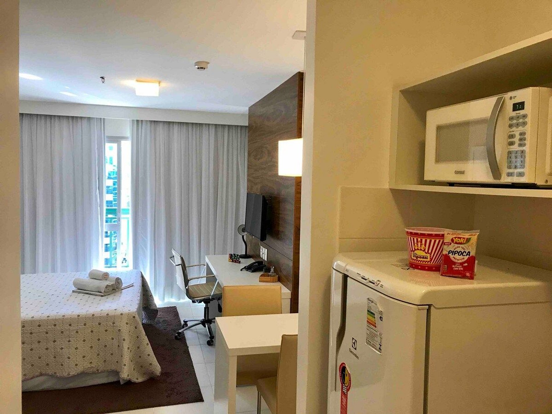 O flat, com 27m², possui ar condicionado e black-out para uma noite tranquila de sono. Além disso, o hotel conta com serviço de quarto 24hrs, roupas de cama limpas e higienizadas e um chuveiro incrível para um banho relaxante. E se caso preferir preparar sua própria comida, o ap possui cozinha compacta para refeições básicas, e geladeira para guardar o seus alimentos. A recepção e segurança funcionam 24 horas por dia, proporcionando tranquilidade durante toda a sua estadia.