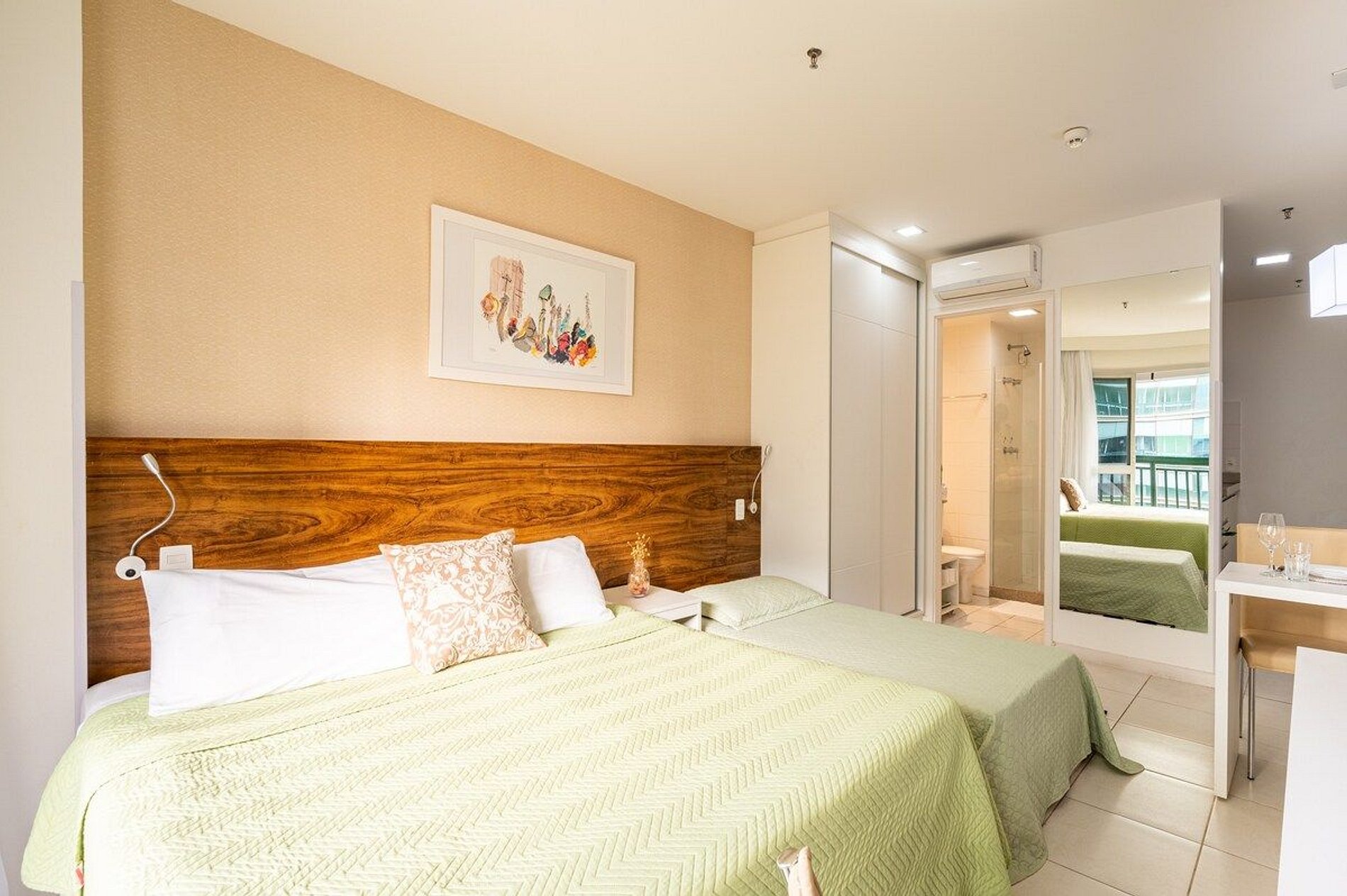 O flat, com 27m², possui ar condicionado e black-out para uma noite tranquila de sono. Além disso, o hotel conta com serviço de quarto 24hrs, roupas de cama limpas e higienizadas e um chuveiro incrível para um banho relaxante. E se caso preferir preparar sua própria comida, o ap possui cozinha compacta para refeições básicas, e geladeira para guardar o seus alimentos. A recepção e segurança funcionam 24 horas por dia, proporcionando tranquilidade durante toda a sua estadia.