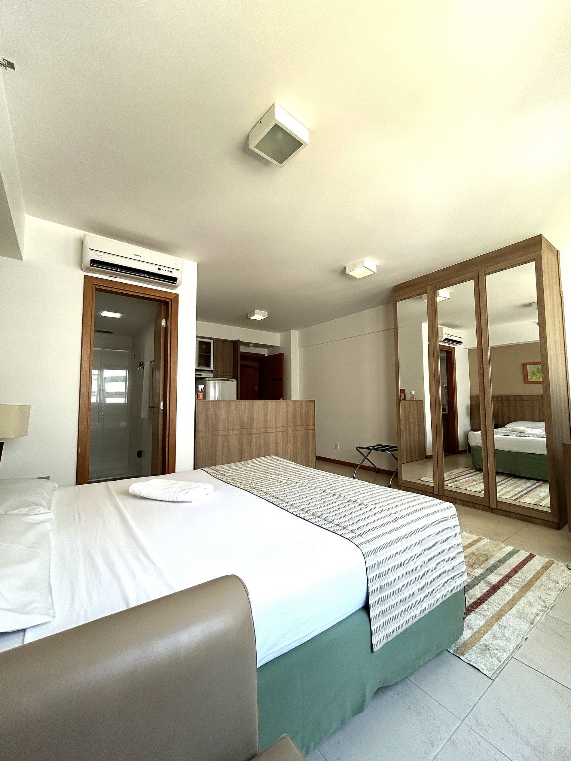 Acomodação 9º andar: Nossa equipe oferece uma experiência excepcional para os hóspedes. Com acomodações confortáveis, serviço de qualidade e atendimento humanizado, garantimos que sua estadia seja memorável. O flat, com 22m², possui ar condicionado e black-out para uma noite tranquila de sono. Além disso, o hotel conta com serviço de quarto 24hrs, roupas de cama limpas e higienizadas e um chuveiro incrível para um banho relaxante. E se caso preferir preparar sua própria comida, o ap possui cozinha compacta para refeições básicas, e geladeira para guardar o seus alimentos A recepção e segurança funcionam 24 horas por dia, proporcionando tranquilidade durante toda a sua estadia. Queremos que vocês se sintam em casa. Estamos prontas para oferecer um atendimento personalizado e garantir que todas as suas necessidades sejam atendidas. Com serviço de quarto e serviços de manutenção disponíveis quando necessário, você terá uma estadia confortável e conveniente.