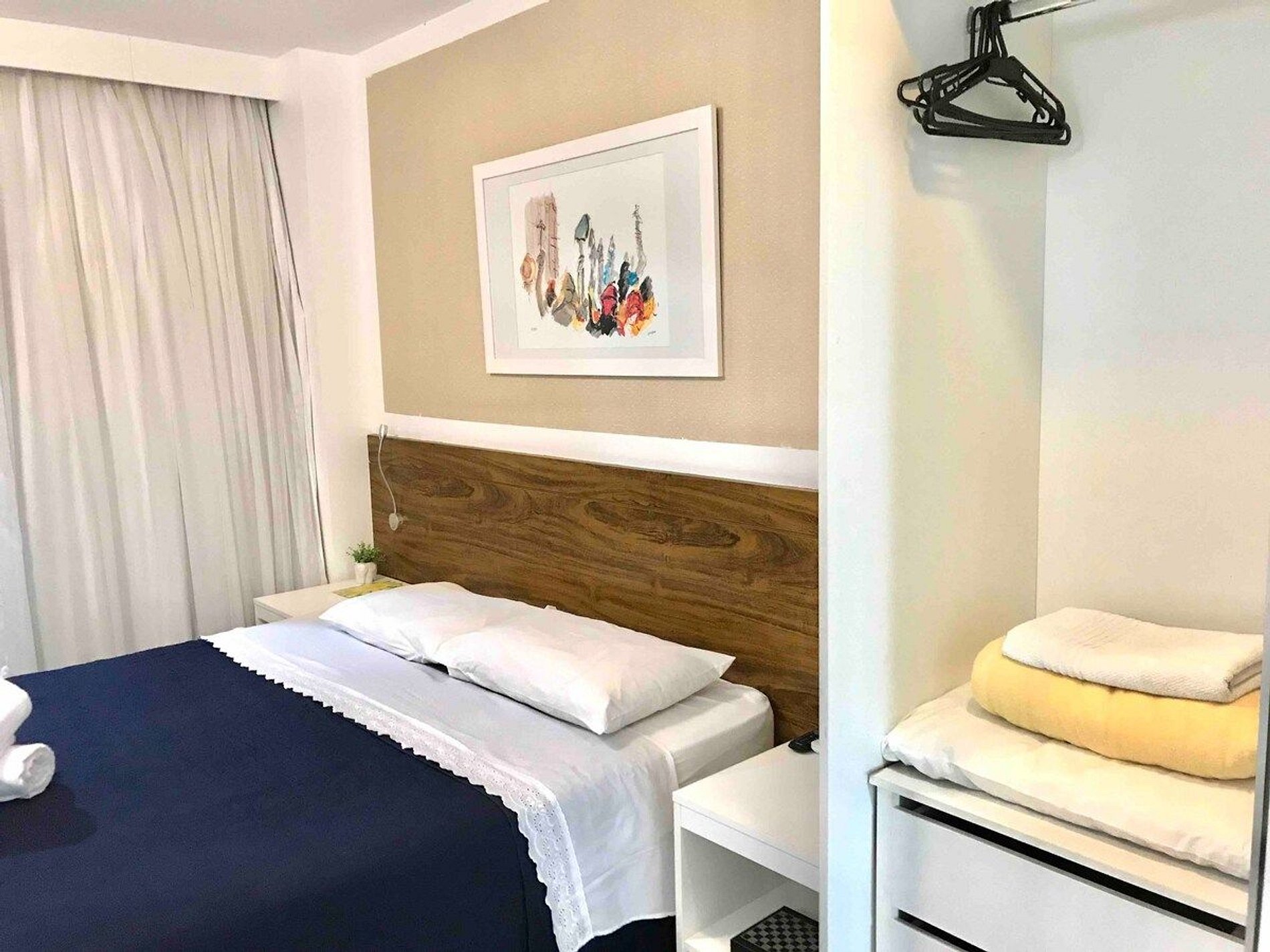 O flat, com 27m², possui ar condicionado e black-out para uma noite tranquila de sono. Além disso, o hotel conta com serviço de quarto 24hrs, roupas de cama limpas e higienizadas e um chuveiro incrível para um banho relaxante. E se caso preferir preparar sua própria comida, o ap possui cozinha compacta para refeições básicas, e geladeira para guardar o seus alimentos. A recepção e segurança funcionam 24 horas por dia, proporcionando tranquilidade durante toda a sua estadia.