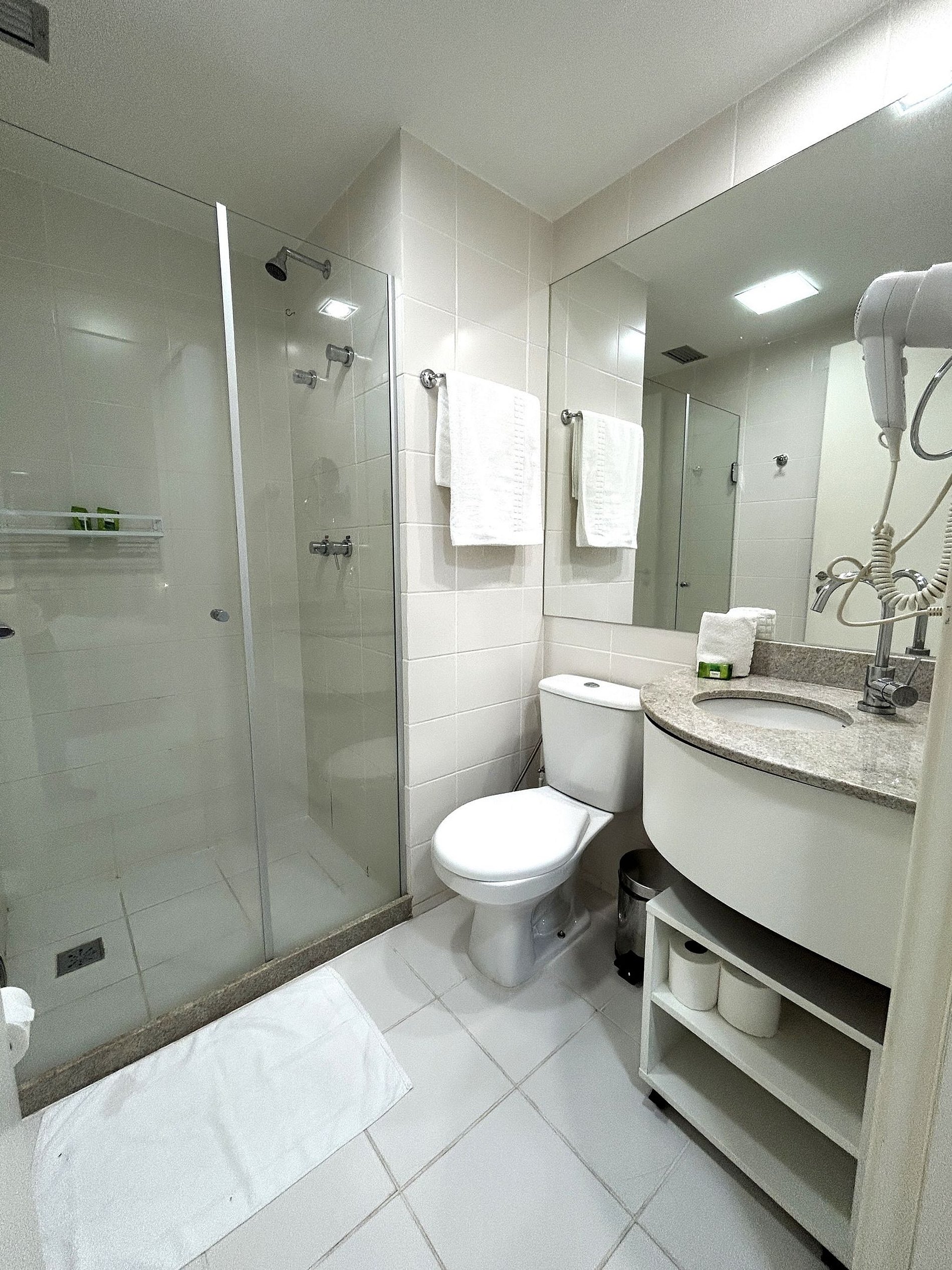 O flat, com 28m², possui ar condicionado e black-out para uma noite tranquila de sono. Além disso, o hotel conta com serviço de quarto 24hrs, roupas de cama limpas e higienizadas e um chuveiro incrível para um banho relaxante. E se caso preferir preparar sua própria comida, o ap possui cozinha compacta para refeições básicas, e geladeira para guardar o seus alimentos. A recepção e segurança funcionam 24 horas por dia, proporcionando tranquilidade durante toda a sua estadia.