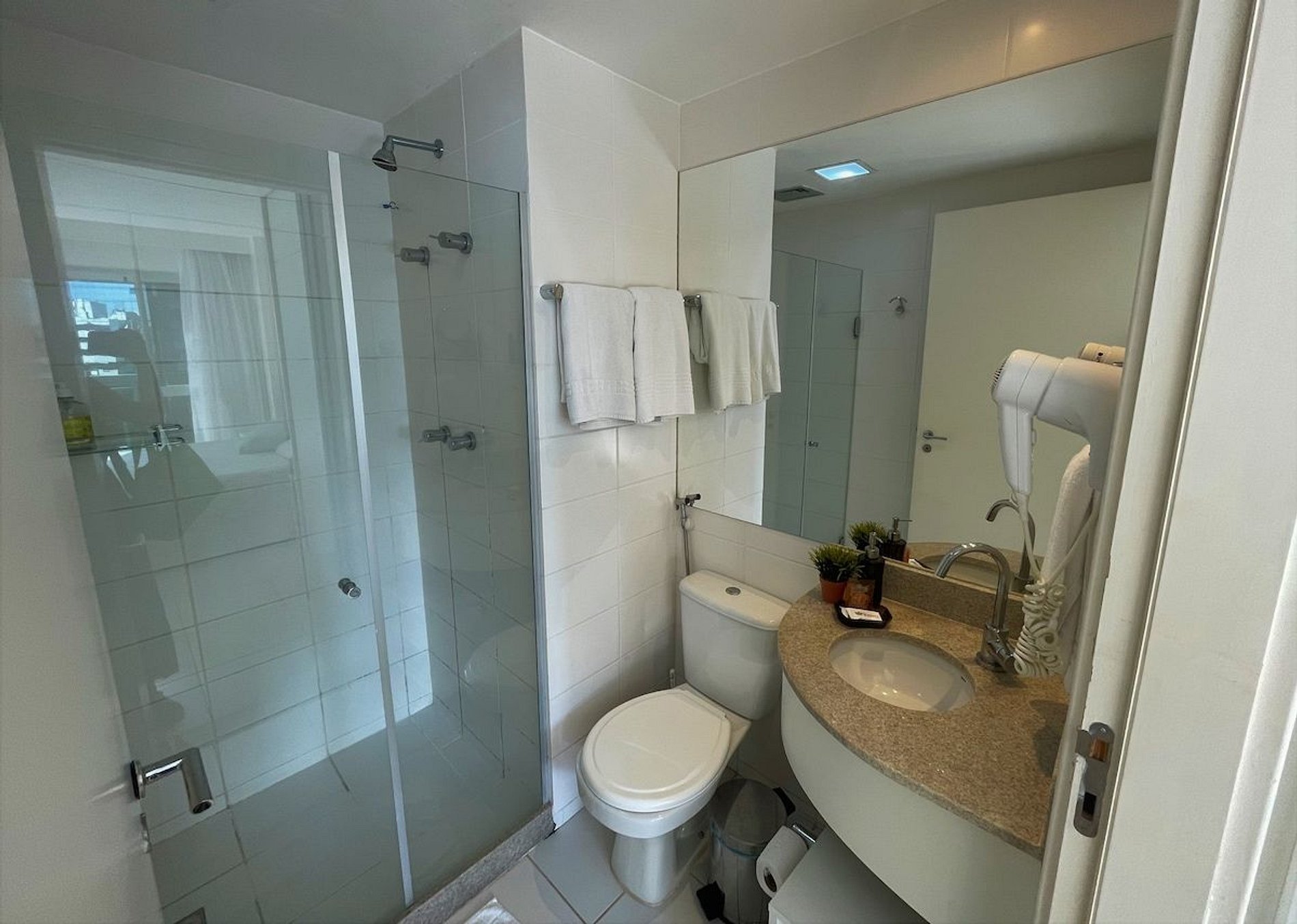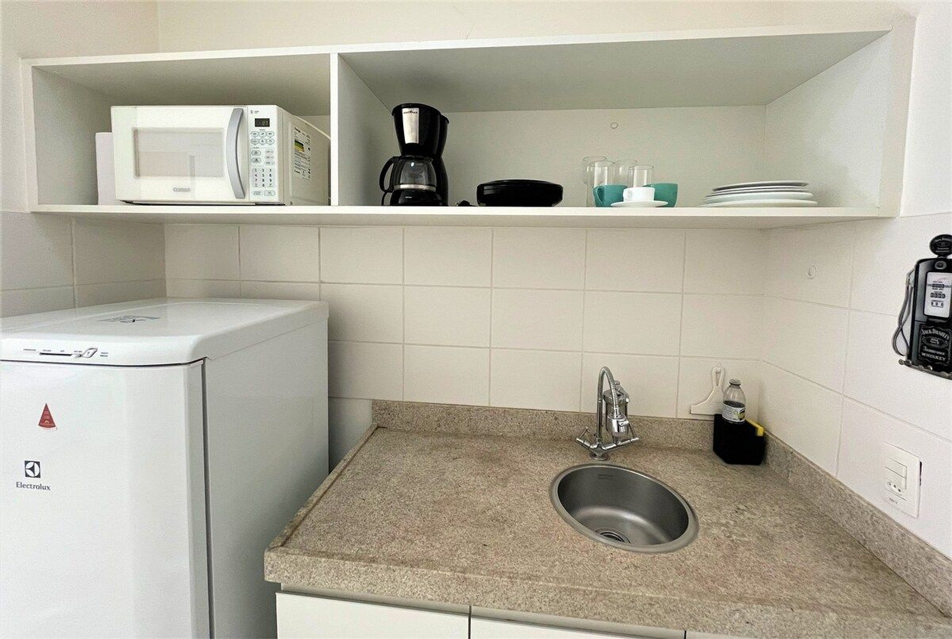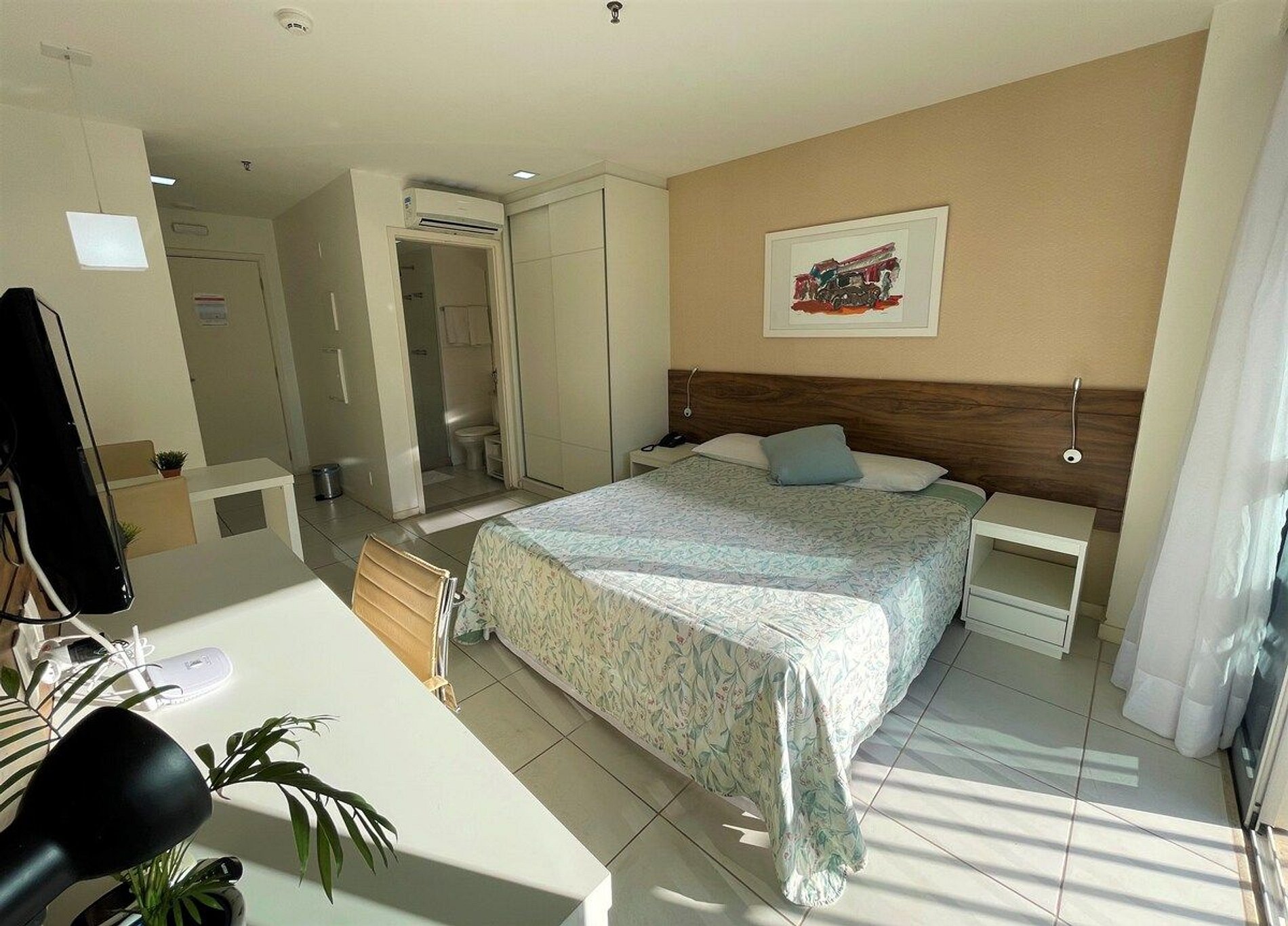 O flat, com 27m², possui ar condicionado e black-out para uma noite tranquila de sono. Além disso, o hotel conta com serviço de quarto 24hrs, roupas de cama limpas e higienizadas e um chuveiro incrível para um banho relaxante. E se caso preferir preparar sua própria comida, o ap possui cozinha compacta para refeições básicas, e geladeira para guardar o seus alimentos. A recepção e segurança funcionam 24 horas por dia, proporcionando tranquilidade durante toda a sua estadia.