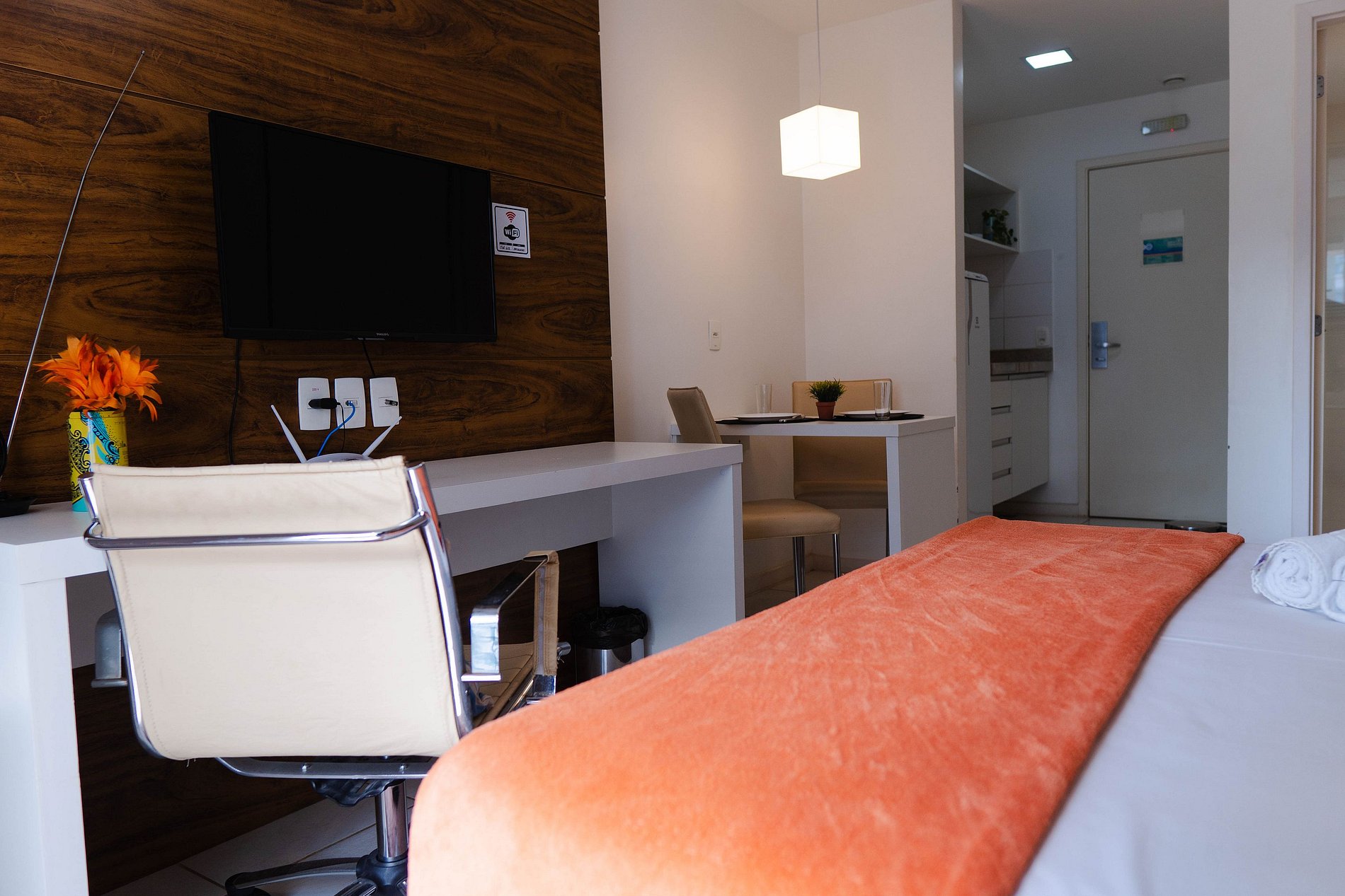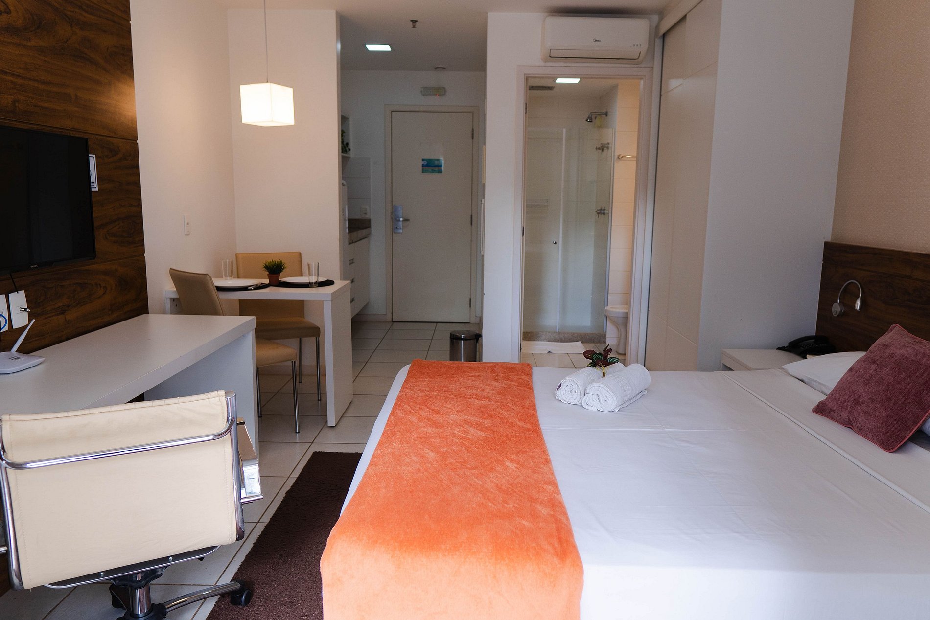 O flat possui ar condicionado e black-out para uma noite tranquila de sono. Além disso, o hotel conta com serviço de quarto 24hrs, roupas de cama limpas e higienizadas e um chuveiro incrível para um banho relaxante. E se caso preferir preparar sua própria comida, o ap possui cozinha compacta para refeições básicas, e geladeira para guardar o seus alimentos. A recepção e segurança funcionam 24 horas por dia, proporcionando tranquilidade durante toda a sua estadia.