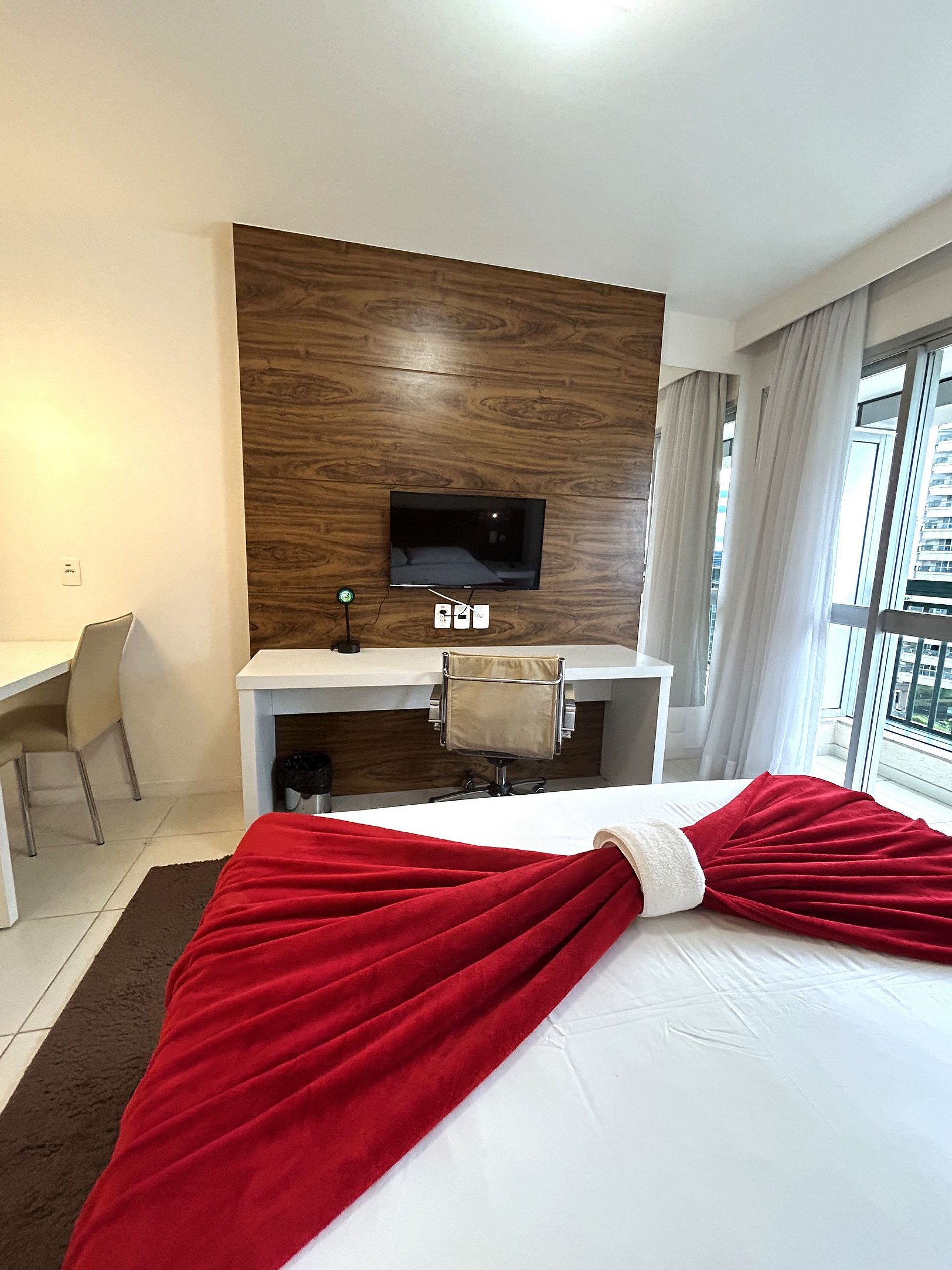 ⭐ Acomodação em quarto de hotel 8º andar com recepção 24hrs: Nossa equipe oferece uma experiência excepcional para os hóspedes. Com acomodações confortáveis, serviço de qualidade e atendimento humanizado, garantimos que sua estadia seja memorável. O flat, com 27m², possui ar condicionado e black-out para uma noite tranquila de sono. Além disso, o hotel conta com serviço de quarto 24hrs, roupas de cama limpas e higienizadas e um chuveiro incrível para um banho relaxante. E se caso preferir preparar sua própria comida, o ap possui cozinha compacta para refeições básicas com micro-ondas, geladeira, para guardar o seus alimentos. A recepção e segurança funcionam 24 horas por dia, proporcionando tranquilidade durante toda a sua estadia. Queremos que vocês se sintam em casa. Estamos prontas para oferecer um atendimento personalizado e garantir que todas as suas necessidades sejam atendidas. Com serviço de quarto e serviços de manutenção disponíveis quando necessário, você terá uma estadia confortável e conveniente.