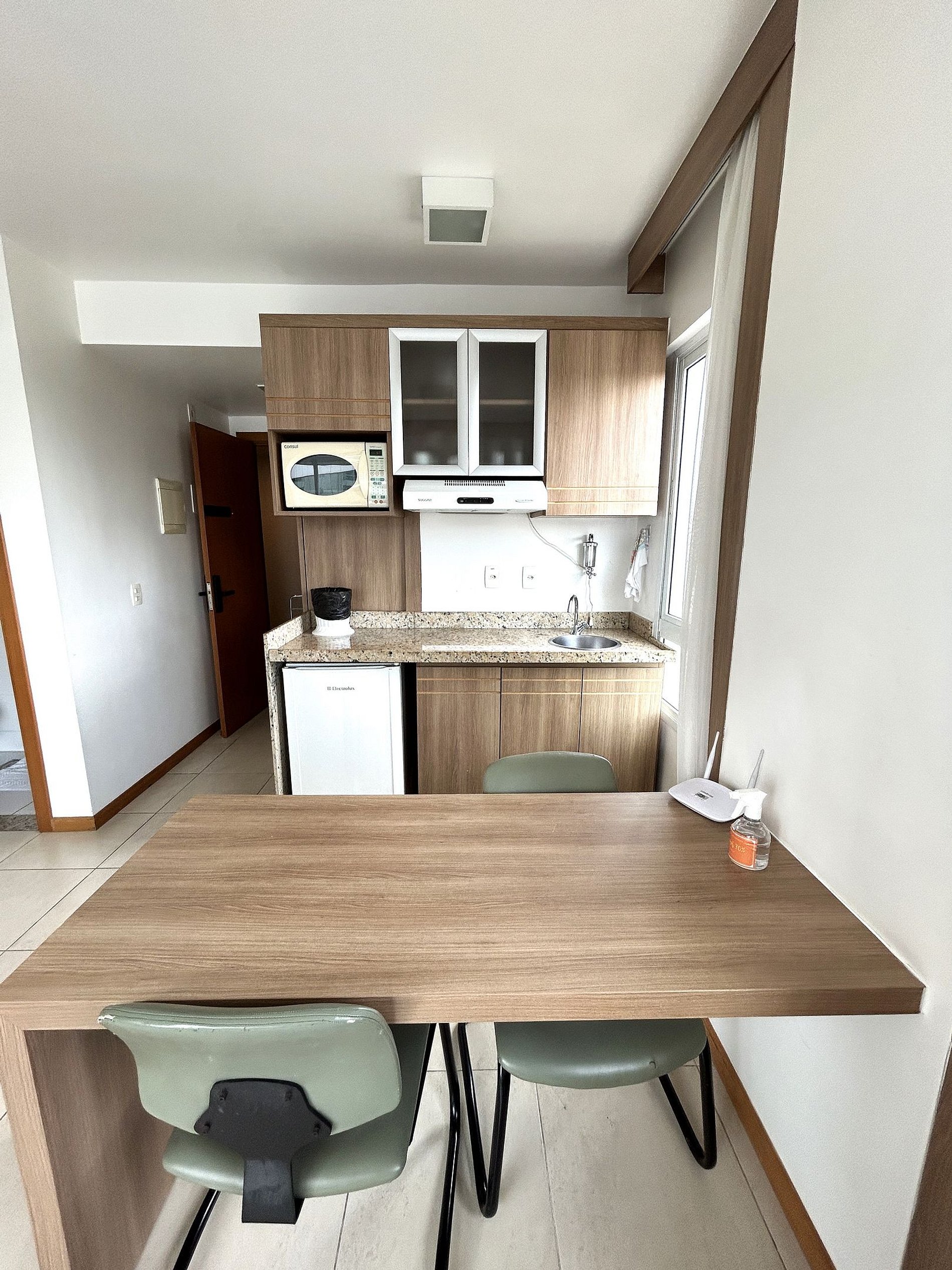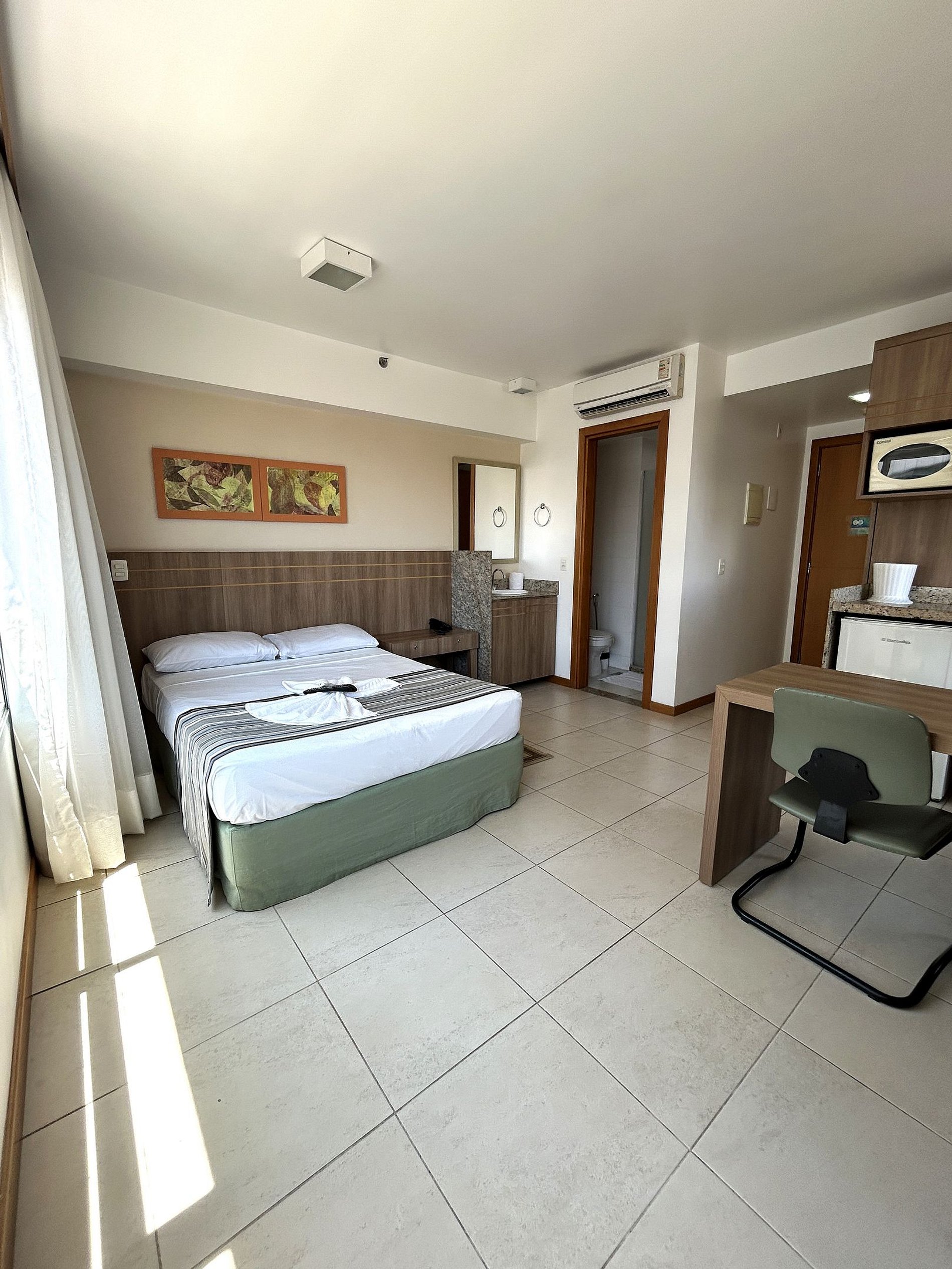 O flat, com 27m², possui ar condicionado e black-out para uma noite tranquila de sono. Além disso, o hotel conta com serviço de quarto 24hrs, roupas de cama limpas e higienizadas e um chuveiro incrível para um banho relaxante. E se caso preferir preparar sua própria comida, o ap possui cozinha compacta para refeições básicas, e geladeira para guardar o seus alimentos A recepção e segurança funcionam 24 horas por dia, proporcionando tranquilidade durante toda a sua estadia.