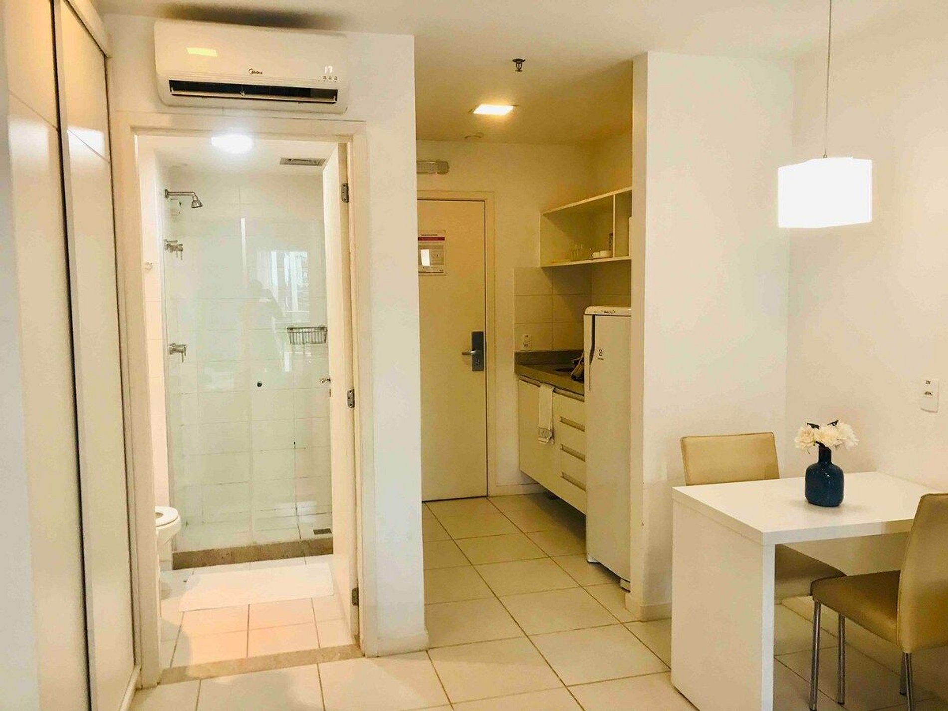 O flat, com 27m², possui ar condicionado e black-out para uma noite tranquila de sono. Além disso, o hotel conta com serviço de quarto 24hrs, roupas de cama limpas e higienizadas e um chuveiro incrível para um banho relaxante. E se caso preferir preparar sua própria comida, o ap possui cozinha compacta para refeições básicas, e geladeira para guardar o seus alimentos. A recepção e segurança funcionam 24 horas por dia, proporcionando tranquilidade durante toda a sua estadia.