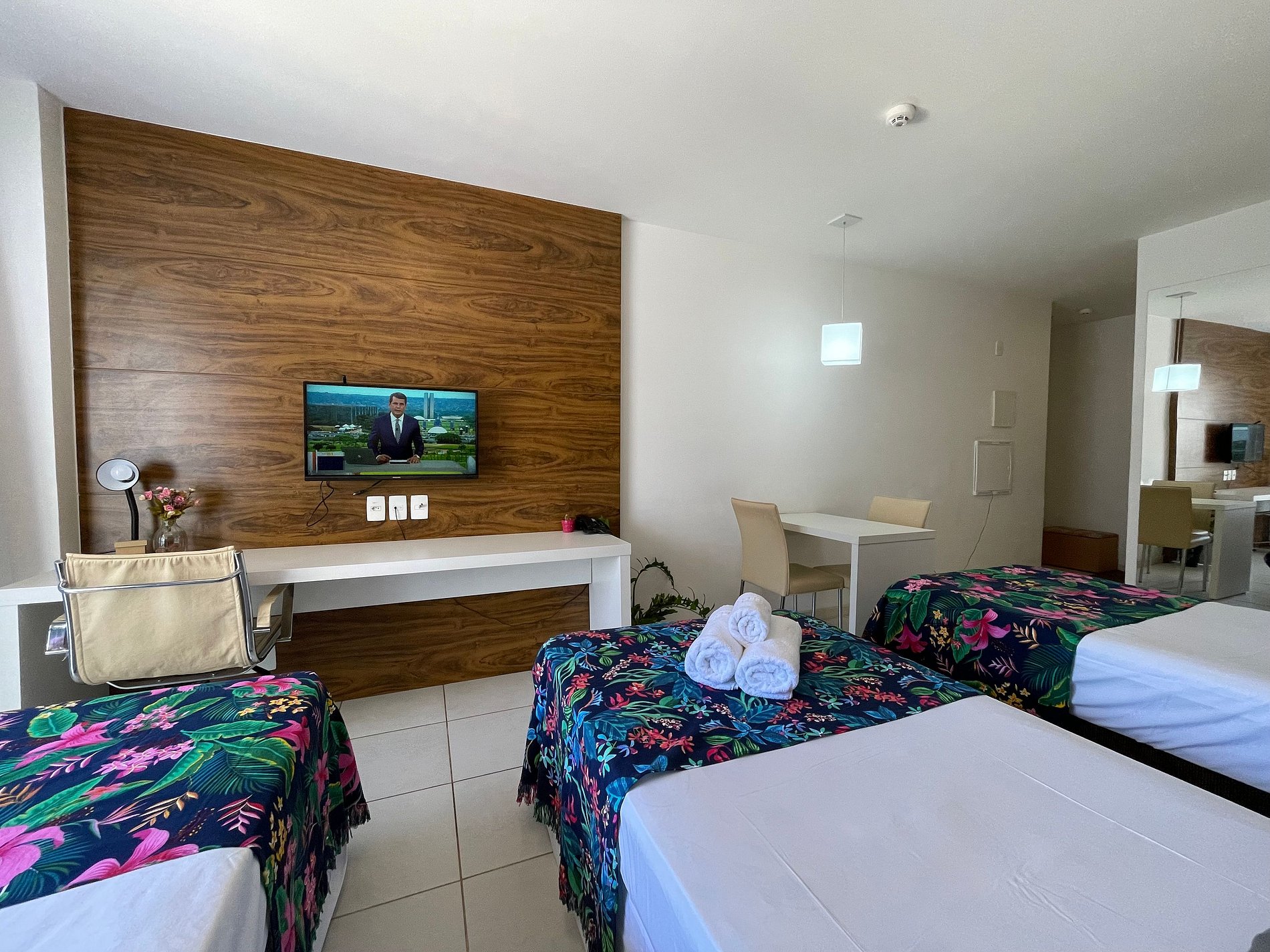 Nosso apartamento acomoda confortavelmente até 4 pessoas, com 1 cama king-size e uma bicama. Para garantir sua melhor experiência, solicitamos que informe com antecedência sua preferência de montagem das camas.